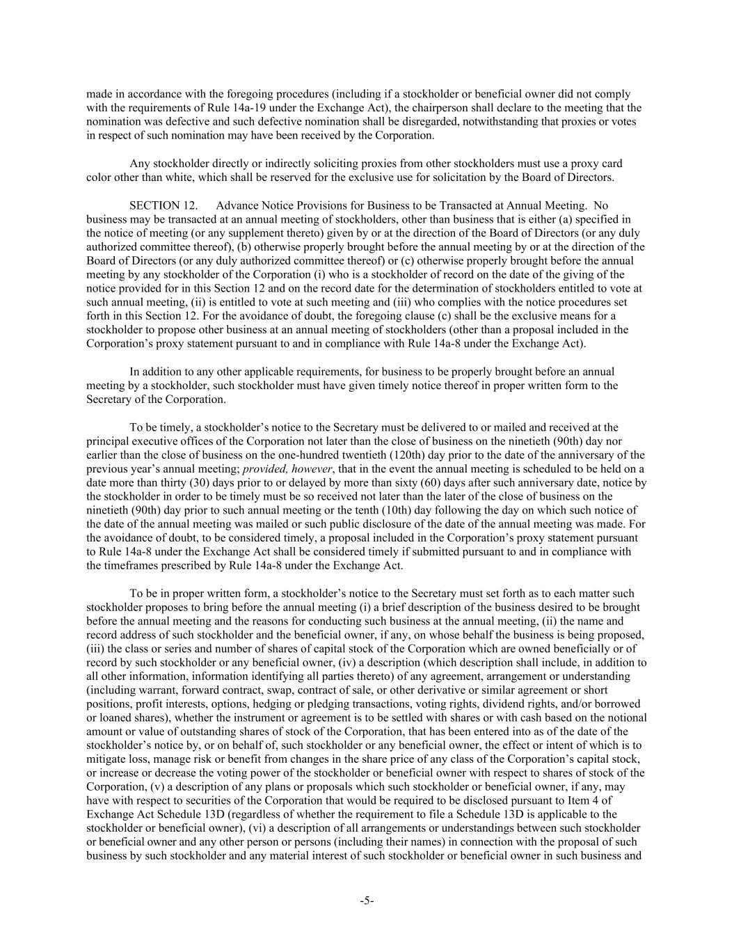 -5- made in accordance with the foregoing procedures (including if a stockholder or beneficial owner did not comply with the requirements of Rule 14a-19 under the Exchange Act), the chairperson shall declare to the meeting that the nomination was defective and such defective nomination shall be disregarded, notwithstanding that proxies or votes in respect of such nomination may have been received by the Corporation. Any stockholder directly or indirectly soliciting proxies from other stockholders must use a proxy card color other than white, which shall be reserved for the exclusive use for solicitation by the Board of Directors. SECTION 12. Advance Notice Provisions for Business to be Transacted at Annual Meeting. No business may be transacted at an annual meeting of stockholders, other than business that is either (a) specified in the notice of meeting (or any supplement thereto) given by or at the direction of the Board of Directors (or any duly authorized committee thereof), (b) otherwise properly brought before the annual meeting by or at the direction of the Board of Directors (or any duly authorized committee thereof) or (c) otherwise properly brought before the annual meeting by any stockholder of the Corporation (i) who is a stockholder of record on the date of the giving of the notice provided for in this Section 12 and on the record date for the determination of stockholders entitled to vote at such annual meeting, (ii) is entitled to vote at such meeting and (iii) who complies with the notice procedures set forth in this Section 12. For the avoidance of doubt, the foregoing clause (c) shall be the exclusive means for a stockholder to propose other business at an annual meeting of stockholders (other than a proposal included in the Corporation’s proxy statement pursuant to and in compliance with Rule 14a-8 under the Exchange Act). In addition to any other applicable requirements, for business to be properly brought before an annual meeting by a stockholder, such stockholder must have given timely notice thereof in proper written form to the Secretary of the Corporation. To be timely, a stockholder’s notice to the Secretary must be delivered to or mailed and received at the principal executive offices of the Corporation not later than the close of business on the ninetieth (90th) day nor earlier than the close of business on the one-hundred twentieth (120th) day prior to the date of the anniversary of the previous year’s annual meeting; provided, however, that in the event the annual meeting is scheduled to be held on a date more than thirty (30) days prior to or delayed by more than sixty (60) days after such anniversary date, notice by the stockholder in order to be timely must be so received not later than the later of the close of business on the ninetieth (90th) day prior to such annual meeting or the tenth (10th) day following the day on which such notice of the date of the annual meeting was mailed or such public disclosure of the date of the annual meeting was made. For the avoidance of doubt, to be considered timely, a proposal included in the Corporation’s proxy statement pursuant to Rule 14a-8 under the Exchange Act shall be considered timely if submitted pursuant to and in compliance with the timeframes prescribed by Rule 14a-8 under the Exchange Act. To be in proper written form, a stockholder’s notice to the Secretary must set forth as to each matter such stockholder proposes to bring before the annual meeting (i) a brief description of the business desired to be brought before the annual meeting and the reasons for conducting such business at the annual meeting, (ii) the name and record address of such stockholder and the beneficial owner, if any, on whose behalf the business is being proposed, (iii) the class or series and number of shares of capital stock of the Corporation which are owned beneficially or of record by such stockholder or any beneficial owner, (iv) a description (which description shall include, in addition to all other information, information identifying all parties thereto) of any agreement, arrangement or understanding (including warrant, forward contract, swap, contract of sale, or other derivative or similar agreement or short positions, profit interests, options, hedging or pledging transactions, voting rights, dividend rights, and/or borrowed or loaned shares), whether the instrument or agreement is to be settled with shares or with cash based on the notional amount or value of outstanding shares of stock of the Corporation, that has been entered into as of the date of the stockholder’s notice by, or on behalf of, such stockholder or any beneficial owner, the effect or intent of which is to mitigate loss, manage risk or benefit from changes in the share price of any class of the Corporation’s capital stock, or increase or decrease the voting power of the stockholder or beneficial owner with respect to shares of stock of the Corporation, (v) a description of any plans or proposals which such stockholder or beneficial owner, if any, may have with respect to securities of the Corporation that would be required to be disclosed pursuant to Item 4 of Exchange Act Schedule 13D (regardless of whether the requirement to file a Schedule 13D is applicable to the stockholder or beneficial owner), (vi) a description of all arrangements or understandings between such stockholder or beneficial owner and any other person or persons (including their names) in connection with the proposal of such business by such stockholder and any material interest of such stockholder or beneficial owner in such business and