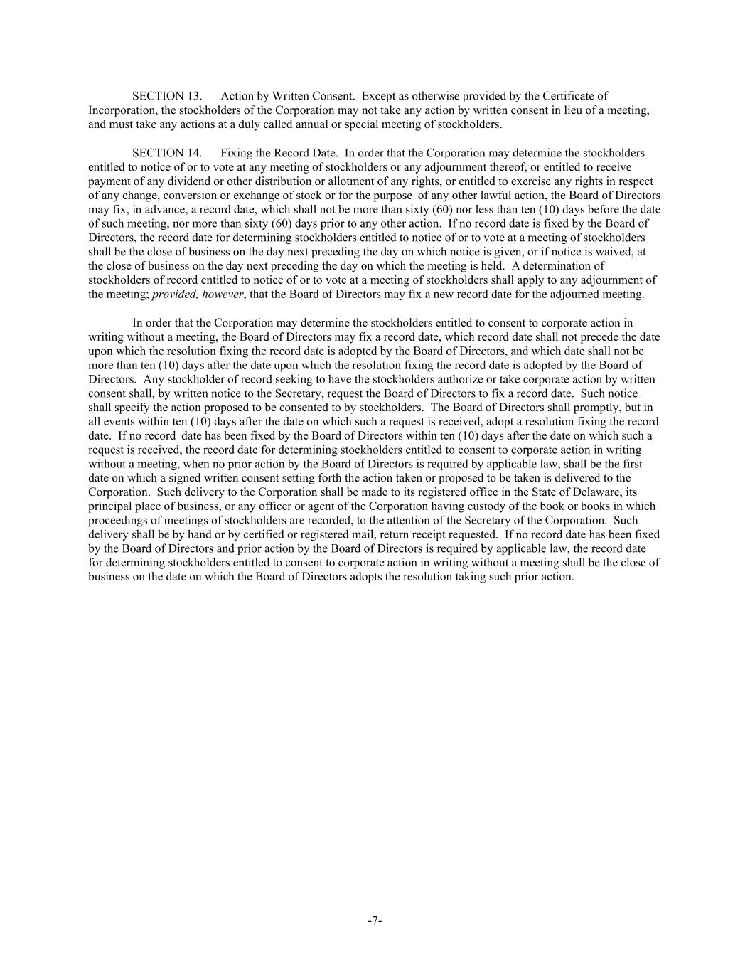 -7- SECTION 13. Action by Written Consent. Except as otherwise provided by the Certificate of Incorporation, the stockholders of the Corporation may not take any action by written consent in lieu of a meeting, and must take any actions at a duly called annual or special meeting of stockholders. SECTION 14. Fixing the Record Date. In order that the Corporation may determine the stockholders entitled to notice of or to vote at any meeting of stockholders or any adjournment thereof, or entitled to receive payment of any dividend or other distribution or allotment of any rights, or entitled to exercise any rights in respect of any change, conversion or exchange of stock or for the purpose of any other lawful action, the Board of Directors may fix, in advance, a record date, which shall not be more than sixty (60) nor less than ten (10) days before the date of such meeting, nor more than sixty (60) days prior to any other action. If no record date is fixed by the Board of Directors, the record date for determining stockholders entitled to notice of or to vote at a meeting of stockholders shall be the close of business on the day next preceding the day on which notice is given, or if notice is waived, at the close of business on the day next preceding the day on which the meeting is held. A determination of stockholders of record entitled to notice of or to vote at a meeting of stockholders shall apply to any adjournment of the meeting; provided, however, that the Board of Directors may fix a new record date for the adjourned meeting. In order that the Corporation may determine the stockholders entitled to consent to corporate action in writing without a meeting, the Board of Directors may fix a record date, which record date shall not precede the date upon which the resolution fixing the record date is adopted by the Board of Directors, and which date shall not be more than ten (10) days after the date upon which the resolution fixing the record date is adopted by the Board of Directors. Any stockholder of record seeking to have the stockholders authorize or take corporate action by written consent shall, by written notice to the Secretary, request the Board of Directors to fix a record date. Such notice shall specify the action proposed to be consented to by stockholders. The Board of Directors shall promptly, but in all events within ten (10) days after the date on which such a request is received, adopt a resolution fixing the record date. If no record date has been fixed by the Board of Directors within ten (10) days after the date on which such a request is received, the record date for determining stockholders entitled to consent to corporate action in writing without a meeting, when no prior action by the Board of Directors is required by applicable law, shall be the first date on which a signed written consent setting forth the action taken or proposed to be taken is delivered to the Corporation. Such delivery to the Corporation shall be made to its registered office in the State of Delaware, its principal place of business, or any officer or agent of the Corporation having custody of the book or books in which proceedings of meetings of stockholders are recorded, to the attention of the Secretary of the Corporation. Such delivery shall be by hand or by certified or registered mail, return receipt requested. If no record date has been fixed by the Board of Directors and prior action by the Board of Directors is required by applicable law, the record date for determining stockholders entitled to consent to corporate action in writing without a meeting shall be the close of business on the date on which the Board of Directors adopts the resolution taking such prior action.