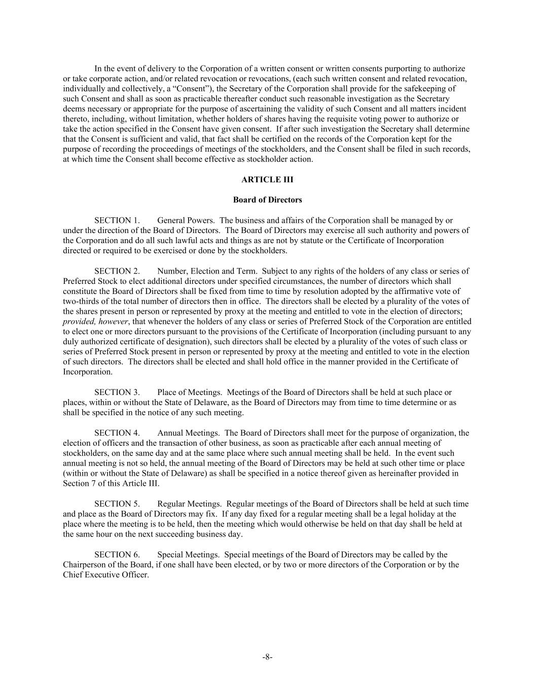 -8- In the event of delivery to the Corporation of a written consent or written consents purporting to authorize or take corporate action, and/or related revocation or revocations, (each such written consent and related revocation, individually and collectively, a “Consent”), the Secretary of the Corporation shall provide for the safekeeping of such Consent and shall as soon as practicable thereafter conduct such reasonable investigation as the Secretary deems necessary or appropriate for the purpose of ascertaining the validity of such Consent and all matters incident thereto, including, without limitation, whether holders of shares having the requisite voting power to authorize or take the action specified in the Consent have given consent. If after such investigation the Secretary shall determine that the Consent is sufficient and valid, that fact shall be certified on the records of the Corporation kept for the purpose of recording the proceedings of meetings of the stockholders, and the Consent shall be filed in such records, at which time the Consent shall become effective as stockholder action. ARTICLE III Board of Directors SECTION 1. General Powers. The business and affairs of the Corporation shall be managed by or under the direction of the Board of Directors. The Board of Directors may exercise all such authority and powers of the Corporation and do all such lawful acts and things as are not by statute or the Certificate of Incorporation directed or required to be exercised or done by the stockholders. SECTION 2. Number, Election and Term. Subject to any rights of the holders of any class or series of Preferred Stock to elect additional directors under specified circumstances, the number of directors which shall constitute the Board of Directors shall be fixed from time to time by resolution adopted by the affirmative vote of two-thirds of the total number of directors then in office. The directors shall be elected by a plurality of the votes of the shares present in person or represented by proxy at the meeting and entitled to vote in the election of directors; provided, however, that whenever the holders of any class or series of Preferred Stock of the Corporation are entitled to elect one or more directors pursuant to the provisions of the Certificate of Incorporation (including pursuant to any duly authorized certificate of designation), such directors shall be elected by a plurality of the votes of such class or series of Preferred Stock present in person or represented by proxy at the meeting and entitled to vote in the election of such directors. The directors shall be elected and shall hold office in the manner provided in the Certificate of Incorporation. SECTION 3. Place of Meetings. Meetings of the Board of Directors shall be held at such place or places, within or without the State of Delaware, as the Board of Directors may from time to time determine or as shall be specified in the notice of any such meeting. SECTION 4. Annual Meetings. The Board of Directors shall meet for the purpose of organization, the election of officers and the transaction of other business, as soon as practicable after each annual meeting of stockholders, on the same day and at the same place where such annual meeting shall be held. In the event such annual meeting is not so held, the annual meeting of the Board of Directors may be held at such other time or place (within or without the State of Delaware) as shall be specified in a notice thereof given as hereinafter provided in Section 7 of this Article III. SECTION 5. Regular Meetings. Regular meetings of the Board of Directors shall be held at such time and place as the Board of Directors may fix. If any day fixed for a regular meeting shall be a legal holiday at the place where the meeting is to be held, then the meeting which would otherwise be held on that day shall be held at the same hour on the next succeeding business day. SECTION 6. Special Meetings. Special meetings of the Board of Directors may be called by the Chairperson of the Board, if one shall have been elected, or by two or more directors of the Corporation or by the Chief Executive Officer.