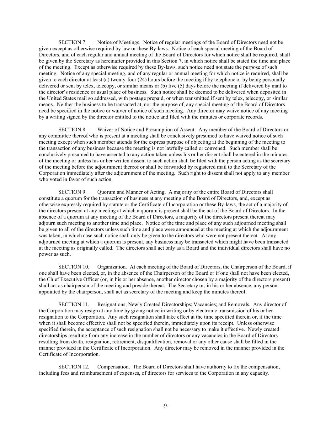 -9- SECTION 7. Notice of Meetings. Notice of regular meetings of the Board of Directors need not be given except as otherwise required by law or these By-laws. Notice of each special meeting of the Board of Directors, and of each regular and annual meeting of the Board of Directors for which notice shall be required, shall be given by the Secretary as hereinafter provided in this Section 7, in which notice shall be stated the time and place of the meeting. Except as otherwise required by these By-laws, such notice need not state the purpose of such meeting. Notice of any special meeting, and of any regular or annual meeting for which notice is required, shall be given to each director at least (a) twenty-four (24) hours before the meeting if by telephone or by being personally delivered or sent by telex, telecopy, or similar means or (b) five (5) days before the meeting if delivered by mail to the director’s residence or usual place of business. Such notice shall be deemed to be delivered when deposited in the United States mail so addressed, with postage prepaid, or when transmitted if sent by telex, telecopy, or similar means. Neither the business to be transacted at, nor the purpose of, any special meeting of the Board of Directors need be specified in the notice or waiver of notice of such meeting. Any director may waive notice of any meeting by a writing signed by the director entitled to the notice and filed with the minutes or corporate records. SECTION 8. Waiver of Notice and Presumption of Assent. Any member of the Board of Directors or any committee thereof who is present at a meeting shall be conclusively presumed to have waived notice of such meeting except when such member attends for the express purpose of objecting at the beginning of the meeting to the transaction of any business because the meeting is not lawfully called or convened. Such member shall be conclusively presumed to have assented to any action taken unless his or her dissent shall be entered in the minutes of the meeting or unless his or her written dissent to such action shall be filed with the person acting as the secretary of the meeting before the adjournment thereof or shall be forwarded by registered mail to the Secretary of the Corporation immediately after the adjournment of the meeting. Such right to dissent shall not apply to any member who voted in favor of such action. SECTION 9. Quorum and Manner of Acting. A majority of the entire Board of Directors shall constitute a quorum for the transaction of business at any meeting of the Board of Directors, and, except as otherwise expressly required by statute or the Certificate of Incorporation or these By-laws, the act of a majority of the directors present at any meeting at which a quorum is present shall be the act of the Board of Directors. In the absence of a quorum at any meeting of the Board of Directors, a majority of the directors present thereat may adjourn such meeting to another time and place. Notice of the time and place of any such adjourned meeting shall be given to all of the directors unless such time and place were announced at the meeting at which the adjournment was taken, in which case such notice shall only be given to the directors who were not present thereat. At any adjourned meeting at which a quorum is present, any business may be transacted which might have been transacted at the meeting as originally called. The directors shall act only as a Board and the individual directors shall have no power as such. SECTION 10. Organization. At each meeting of the Board of Directors, the Chairperson of the Board, if one shall have been elected, or, in the absence of the Chairperson of the Board or if one shall not have been elected, the Chief Executive Officer (or, in his or her absence, another director chosen by a majority of the directors present) shall act as chairperson of the meeting and preside thereat. The Secretary or, in his or her absence, any person appointed by the chairperson, shall act as secretary of the meeting and keep the minutes thereof. SECTION 11. Resignations; Newly Created Directorships; Vacancies; and Removals. Any director of the Corporation may resign at any time by giving notice in writing or by electronic transmission of his or her resignation to the Corporation. Any such resignation shall take effect at the time specified therein or, if the time when it shall become effective shall not be specified therein, immediately upon its receipt. Unless otherwise specified therein, the acceptance of such resignation shall not be necessary to make it effective. Newly created directorships resulting from any increase in the number of directors or any vacancies in the Board of Directors resulting from death, resignation, retirement, disqualification, removal or any other cause shall be filled in the manner provided in the Certificate of Incorporation. Any director may be removed in the manner provided in the Certificate of Incorporation. SECTION 12. Compensation. The Board of Directors shall have authority to fix the compensation, including fees and reimbursement of expenses, of directors for services to the Corporation in any capacity.