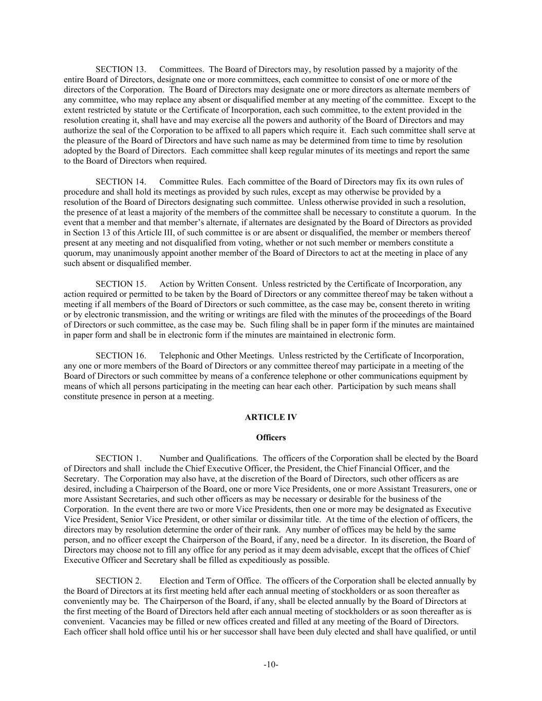 -10- SECTION 13. Committees. The Board of Directors may, by resolution passed by a majority of the entire Board of Directors, designate one or more committees, each committee to consist of one or more of the directors of the Corporation. The Board of Directors may designate one or more directors as alternate members of any committee, who may replace any absent or disqualified member at any meeting of the committee. Except to the extent restricted by statute or the Certificate of Incorporation, each such committee, to the extent provided in the resolution creating it, shall have and may exercise all the powers and authority of the Board of Directors and may authorize the seal of the Corporation to be affixed to all papers which require it. Each such committee shall serve at the pleasure of the Board of Directors and have such name as may be determined from time to time by resolution adopted by the Board of Directors. Each committee shall keep regular minutes of its meetings and report the same to the Board of Directors when required. SECTION 14. Committee Rules. Each committee of the Board of Directors may fix its own rules of procedure and shall hold its meetings as provided by such rules, except as may otherwise be provided by a resolution of the Board of Directors designating such committee. Unless otherwise provided in such a resolution, the presence of at least a majority of the members of the committee shall be necessary to constitute a quorum. In the event that a member and that member’s alternate, if alternates are designated by the Board of Directors as provided in Section 13 of this Article III, of such committee is or are absent or disqualified, the member or members thereof present at any meeting and not disqualified from voting, whether or not such member or members constitute a quorum, may unanimously appoint another member of the Board of Directors to act at the meeting in place of any such absent or disqualified member. SECTION 15. Action by Written Consent. Unless restricted by the Certificate of Incorporation, any action required or permitted to be taken by the Board of Directors or any committee thereof may be taken without a meeting if all members of the Board of Directors or such committee, as the case may be, consent thereto in writing or by electronic transmission, and the writing or writings are filed with the minutes of the proceedings of the Board of Directors or such committee, as the case may be. Such filing shall be in paper form if the minutes are maintained in paper form and shall be in electronic form if the minutes are maintained in electronic form. SECTION 16. Telephonic and Other Meetings. Unless restricted by the Certificate of Incorporation, any one or more members of the Board of Directors or any committee thereof may participate in a meeting of the Board of Directors or such committee by means of a conference telephone or other communications equipment by means of which all persons participating in the meeting can hear each other. Participation by such means shall constitute presence in person at a meeting. ARTICLE IV Officers SECTION 1. Number and Qualifications. The officers of the Corporation shall be elected by the Board of Directors and shall include the Chief Executive Officer, the President, the Chief Financial Officer, and the Secretary. The Corporation may also have, at the discretion of the Board of Directors, such other officers as are desired, including a Chairperson of the Board, one or more Vice Presidents, one or more Assistant Treasurers, one or more Assistant Secretaries, and such other officers as may be necessary or desirable for the business of the Corporation. In the event there are two or more Vice Presidents, then one or more may be designated as Executive Vice President, Senior Vice President, or other similar or dissimilar title. At the time of the election of officers, the directors may by resolution determine the order of their rank. Any number of offices may be held by the same person, and no officer except the Chairperson of the Board, if any, need be a director. In its discretion, the Board of Directors may choose not to fill any office for any period as it may deem advisable, except that the offices of Chief Executive Officer and Secretary shall be filled as expeditiously as possible. SECTION 2. Election and Term of Office. The officers of the Corporation shall be elected annually by the Board of Directors at its first meeting held after each annual meeting of stockholders or as soon thereafter as conveniently may be. The Chairperson of the Board, if any, shall be elected annually by the Board of Directors at the first meeting of the Board of Directors held after each annual meeting of stockholders or as soon thereafter as is convenient. Vacancies may be filled or new offices created and filled at any meeting of the Board of Directors. Each officer shall hold office until his or her successor shall have been duly elected and shall have qualified, or until
