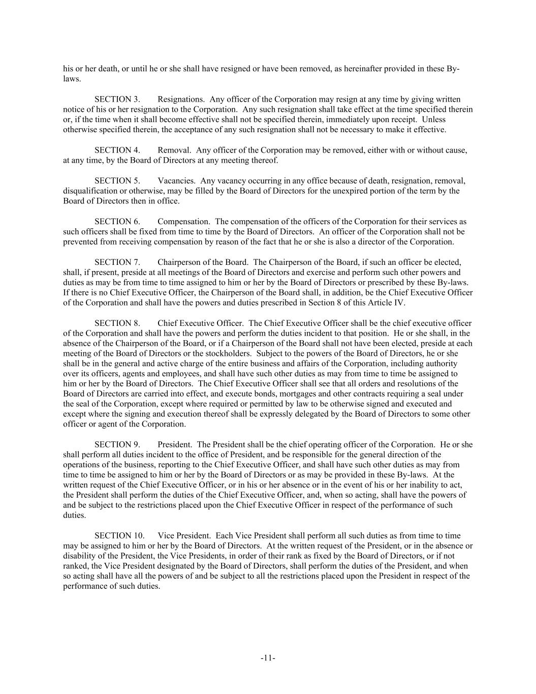 -11- his or her death, or until he or she shall have resigned or have been removed, as hereinafter provided in these By- laws. SECTION 3. Resignations. Any officer of the Corporation may resign at any time by giving written notice of his or her resignation to the Corporation. Any such resignation shall take effect at the time specified therein or, if the time when it shall become effective shall not be specified therein, immediately upon receipt. Unless otherwise specified therein, the acceptance of any such resignation shall not be necessary to make it effective. SECTION 4. Removal. Any officer of the Corporation may be removed, either with or without cause, at any time, by the Board of Directors at any meeting thereof. SECTION 5. Vacancies. Any vacancy occurring in any office because of death, resignation, removal, disqualification or otherwise, may be filled by the Board of Directors for the unexpired portion of the term by the Board of Directors then in office. SECTION 6. Compensation. The compensation of the officers of the Corporation for their services as such officers shall be fixed from time to time by the Board of Directors. An officer of the Corporation shall not be prevented from receiving compensation by reason of the fact that he or she is also a director of the Corporation. SECTION 7. Chairperson of the Board. The Chairperson of the Board, if such an officer be elected, shall, if present, preside at all meetings of the Board of Directors and exercise and perform such other powers and duties as may be from time to time assigned to him or her by the Board of Directors or prescribed by these By-laws. If there is no Chief Executive Officer, the Chairperson of the Board shall, in addition, be the Chief Executive Officer of the Corporation and shall have the powers and duties prescribed in Section 8 of this Article IV. SECTION 8. Chief Executive Officer. The Chief Executive Officer shall be the chief executive officer of the Corporation and shall have the powers and perform the duties incident to that position. He or she shall, in the absence of the Chairperson of the Board, or if a Chairperson of the Board shall not have been elected, preside at each meeting of the Board of Directors or the stockholders. Subject to the powers of the Board of Directors, he or she shall be in the general and active charge of the entire business and affairs of the Corporation, including authority over its officers, agents and employees, and shall have such other duties as may from time to time be assigned to him or her by the Board of Directors. The Chief Executive Officer shall see that all orders and resolutions of the Board of Directors are carried into effect, and execute bonds, mortgages and other contracts requiring a seal under the seal of the Corporation, except where required or permitted by law to be otherwise signed and executed and except where the signing and execution thereof shall be expressly delegated by the Board of Directors to some other officer or agent of the Corporation. SECTION 9. President. The President shall be the chief operating officer of the Corporation. He or she shall perform all duties incident to the office of President, and be responsible for the general direction of the operations of the business, reporting to the Chief Executive Officer, and shall have such other duties as may from time to time be assigned to him or her by the Board of Directors or as may be provided in these By-laws. At the written request of the Chief Executive Officer, or in his or her absence or in the event of his or her inability to act, the President shall perform the duties of the Chief Executive Officer, and, when so acting, shall have the powers of and be subject to the restrictions placed upon the Chief Executive Officer in respect of the performance of such duties. SECTION 10. Vice President. Each Vice President shall perform all such duties as from time to time may be assigned to him or her by the Board of Directors. At the written request of the President, or in the absence or disability of the President, the Vice Presidents, in order of their rank as fixed by the Board of Directors, or if not ranked, the Vice President designated by the Board of Directors, shall perform the duties of the President, and when so acting shall have all the powers of and be subject to all the restrictions placed upon the President in respect of the performance of such duties.