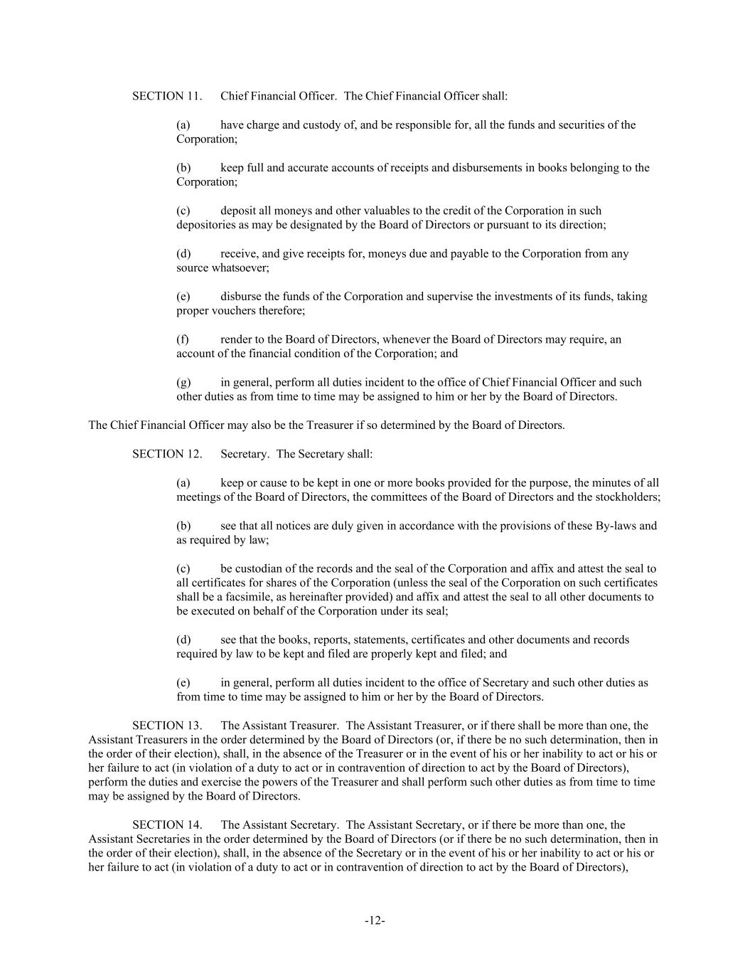 -12- SECTION 11. Chief Financial Officer. The Chief Financial Officer shall: (a) have charge and custody of, and be responsible for, all the funds and securities of the Corporation; (b) keep full and accurate accounts of receipts and disbursements in books belonging to the Corporation; (c) deposit all moneys and other valuables to the credit of the Corporation in such depositories as may be designated by the Board of Directors or pursuant to its direction; (d) receive, and give receipts for, moneys due and payable to the Corporation from any source whatsoever; (e) disburse the funds of the Corporation and supervise the investments of its funds, taking proper vouchers therefore; (f) render to the Board of Directors, whenever the Board of Directors may require, an account of the financial condition of the Corporation; and (g) in general, perform all duties incident to the office of Chief Financial Officer and such other duties as from time to time may be assigned to him or her by the Board of Directors. The Chief Financial Officer may also be the Treasurer if so determined by the Board of Directors. SECTION 12. Secretary. The Secretary shall: (a) keep or cause to be kept in one or more books provided for the purpose, the minutes of all meetings of the Board of Directors, the committees of the Board of Directors and the stockholders; (b) see that all notices are duly given in accordance with the provisions of these By-laws and as required by law; (c) be custodian of the records and the seal of the Corporation and affix and attest the seal to all certificates for shares of the Corporation (unless the seal of the Corporation on such certificates shall be a facsimile, as hereinafter provided) and affix and attest the seal to all other documents to be executed on behalf of the Corporation under its seal; (d) see that the books, reports, statements, certificates and other documents and records required by law to be kept and filed are properly kept and filed; and (e) in general, perform all duties incident to the office of Secretary and such other duties as from time to time may be assigned to him or her by the Board of Directors. SECTION 13. The Assistant Treasurer. The Assistant Treasurer, or if there shall be more than one, the Assistant Treasurers in the order determined by the Board of Directors (or, if there be no such determination, then in the order of their election), shall, in the absence of the Treasurer or in the event of his or her inability to act or his or her failure to act (in violation of a duty to act or in contravention of direction to act by the Board of Directors), perform the duties and exercise the powers of the Treasurer and shall perform such other duties as from time to time may be assigned by the Board of Directors. SECTION 14. The Assistant Secretary. The Assistant Secretary, or if there be more than one, the Assistant Secretaries in the order determined by the Board of Directors (or if there be no such determination, then in the order of their election), shall, in the absence of the Secretary or in the event of his or her inability to act or his or her failure to act (in violation of a duty to act or in contravention of direction to act by the Board of Directors),