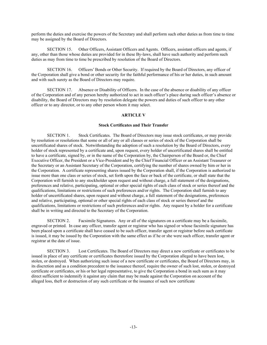 -13- perform the duties and exercise the powers of the Secretary and shall perform such other duties as from time to time may be assigned by the Board of Directors. SECTION 15. Other Officers, Assistant Officers and Agents. Officers, assistant officers and agents, if any, other than those whose duties are provided for in these By-laws, shall have such authority and perform such duties as may from time to time be prescribed by resolution of the Board of Directors. SECTION 16. Officers’ Bonds or Other Security. If required by the Board of Directors, any officer of the Corporation shall give a bond or other security for the faithful performance of his or her duties, in such amount and with such surety as the Board of Directors may require. SECTION 17. Absence or Disability of Officers. In the case of the absence or disability of any officer of the Corporation and of any person hereby authorized to act in such officer’s place during such officer’s absence or disability, the Board of Directors may by resolution delegate the powers and duties of such officer to any other officer or to any director, or to any other person whom it may select. ARTICLE V Stock Certificates and Their Transfer SECTION 1. Stock Certificates. The Board of Directors may issue stock certificates, or may provide by resolution or resolutions that some or all of any or all classes or series of stock of the Corporation shall be uncertificated shares of stock. Notwithstanding the adoption of such a resolution by the Board of Directors, every holder of stock represented by a certificate and, upon request, every holder of uncertificated shares shall be entitled to have a certificate, signed by, or in the name of the Corporation by, the Chairperson of the Board or, the Chief Executive Officer, the President or a Vice-President and by the Chief Financial Officer or an Assistant Treasurer or the Secretary or an Assistant Secretary of the Corporation, certifying the number of shares owned by him or her in the Corporation. A certificate representing shares issued by the Corporation shall, if the Corporation is authorized to issue more than one class or series of stock, set forth upon the face or back of the certificate, or shall state that the Corporation will furnish to any stockholder upon request and without charge, a full statement of the designations, preferences and relative, participating, optional or other special rights of each class of stock or series thereof and the qualifications, limitations or restrictions of such preferences and/or rights. The Corporation shall furnish to any holder of uncertificated shares, upon request and without charge, a full statement of the designations, preferences and relative, participating, optional or other special rights of each class of stock or series thereof and the qualifications, limitations or restrictions of such preferences and/or rights. Any request by a holder for a certificate shall be in writing and directed to the Secretary of the Corporation. SECTION 2. Facsimile Signatures. Any or all of the signatures on a certificate may be a facsimile, engraved or printed. In case any officer, transfer agent or registrar who has signed or whose facsimile signature has been placed upon a certificate shall have ceased to be such officer, transfer agent or registrar before such certificate is issued, it may be issued by the Corporation with the same effect as if he or she were such officer, transfer agent or registrar at the date of issue. SECTION 3. Lost Certificates. The Board of Directors may direct a new certificate or certificates to be issued in place of any certificate or certificates theretofore issued by the Corporation alleged to have been lost, stolen, or destroyed. When authorizing such issue of a new certificate or certificates, the Board of Directors may, in its discretion and as a condition precedent to the issuance thereof, require the owner of such lost, stolen, or destroyed certificate or certificates, or his or her legal representative, to give the Corporation a bond in such sum as it may direct sufficient to indemnify it against any claim that may be made against the Corporation on account of the alleged loss, theft or destruction of any such certificate or the issuance of such new certificate