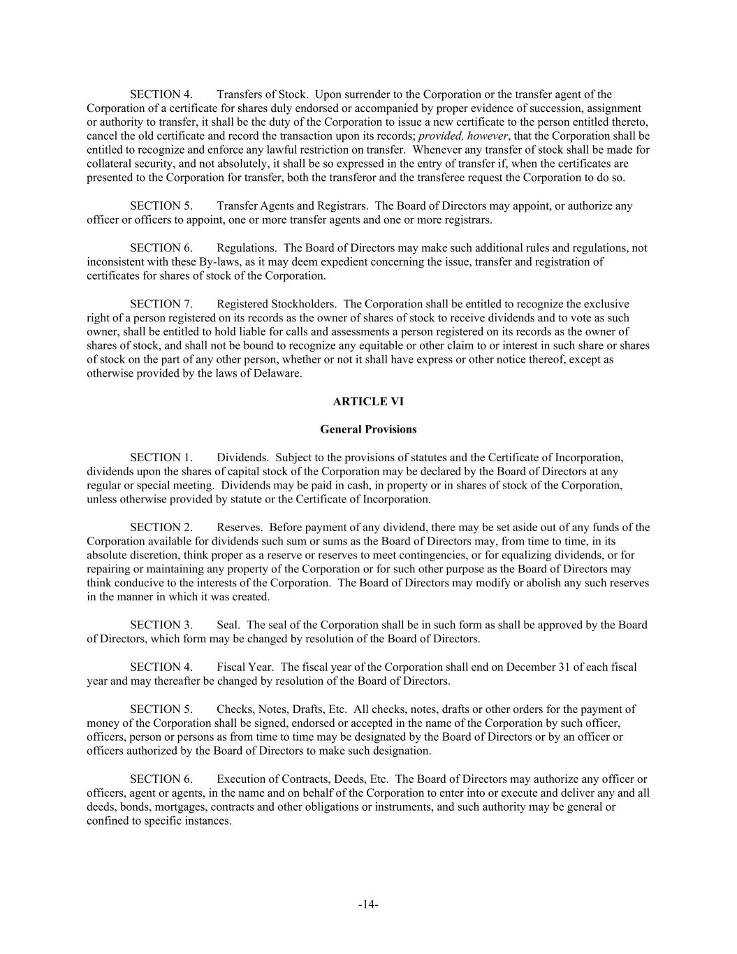 -14- SECTION 4. Transfers of Stock. Upon surrender to the Corporation or the transfer agent of the Corporation of a certificate for shares duly endorsed or accompanied by proper evidence of succession, assignment or authority to transfer, it shall be the duty of the Corporation to issue a new certificate to the person entitled thereto, cancel the old certificate and record the transaction upon its records; provided, however, that the Corporation shall be entitled to recognize and enforce any lawful restriction on transfer. Whenever any transfer of stock shall be made for collateral security, and not absolutely, it shall be so expressed in the entry of transfer if, when the certificates are presented to the Corporation for transfer, both the transferor and the transferee request the Corporation to do so. SECTION 5. Transfer Agents and Registrars. The Board of Directors may appoint, or authorize any officer or officers to appoint, one or more transfer agents and one or more registrars. SECTION 6. Regulations. The Board of Directors may make such additional rules and regulations, not inconsistent with these By-laws, as it may deem expedient concerning the issue, transfer and registration of certificates for shares of stock of the Corporation. SECTION 7. Registered Stockholders. The Corporation shall be entitled to recognize the exclusive right of a person registered on its records as the owner of shares of stock to receive dividends and to vote as such owner, shall be entitled to hold liable for calls and assessments a person registered on its records as the owner of shares of stock, and shall not be bound to recognize any equitable or other claim to or interest in such share or shares of stock on the part of any other person, whether or not it shall have express or other notice thereof, except as otherwise provided by the laws of Delaware. ARTICLE VI General Provisions SECTION 1. Dividends. Subject to the provisions of statutes and the Certificate of Incorporation, dividends upon the shares of capital stock of the Corporation may be declared by the Board of Directors at any regular or special meeting. Dividends may be paid in cash, in property or in shares of stock of the Corporation, unless otherwise provided by statute or the Certificate of Incorporation. SECTION 2. Reserves. Before payment of any dividend, there may be set aside out of any funds of the Corporation available for dividends such sum or sums as the Board of Directors may, from time to time, in its absolute discretion, think proper as a reserve or reserves to meet contingencies, or for equalizing dividends, or for repairing or maintaining any property of the Corporation or for such other purpose as the Board of Directors may think conducive to the interests of the Corporation. The Board of Directors may modify or abolish any such reserves in the manner in which it was created. SECTION 3. Seal. The seal of the Corporation shall be in such form as shall be approved by the Board of Directors, which form may be changed by resolution of the Board of Directors. SECTION 4. Fiscal Year. The fiscal year of the Corporation shall end on December 31 of each fiscal year and may thereafter be changed by resolution of the Board of Directors. SECTION 5. Checks, Notes, Drafts, Etc. All checks, notes, drafts or other orders for the payment of money of the Corporation shall be signed, endorsed or accepted in the name of the Corporation by such officer, officers, person or persons as from time to time may be designated by the Board of Directors or by an officer or officers authorized by the Board of Directors to make such designation. SECTION 6. Execution of Contracts, Deeds, Etc. The Board of Directors may authorize any officer or officers, agent or agents, in the name and on behalf of the Corporation to enter into or execute and deliver any and all deeds, bonds, mortgages, contracts and other obligations or instruments, and such authority may be general or confined to specific instances.