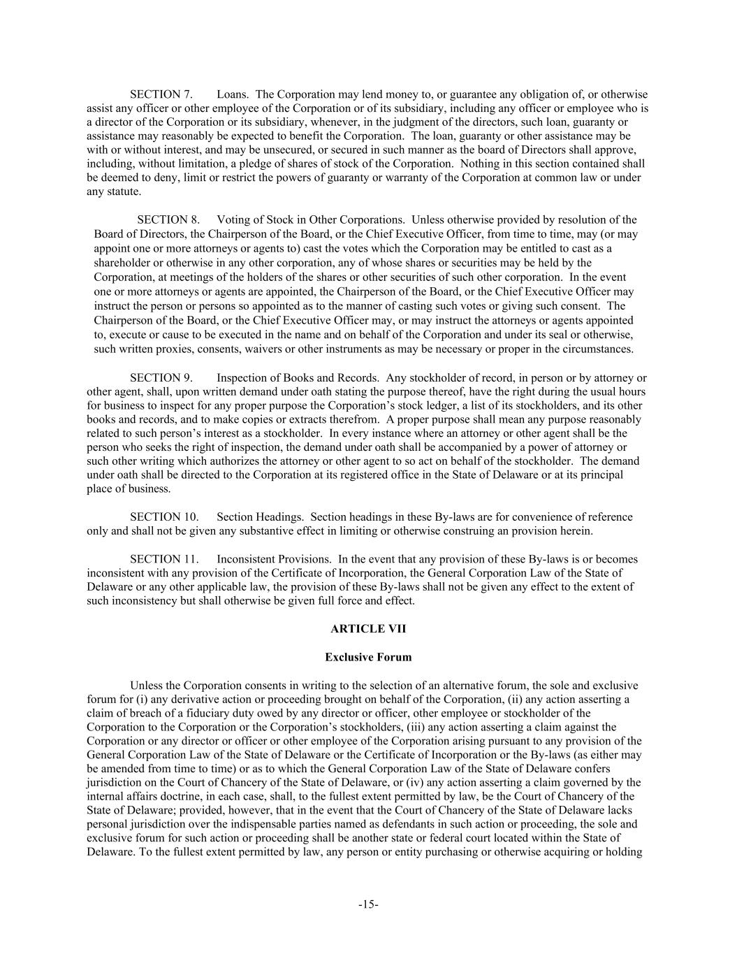 -15- SECTION 7. Loans. The Corporation may lend money to, or guarantee any obligation of, or otherwise assist any officer or other employee of the Corporation or of its subsidiary, including any officer or employee who is a director of the Corporation or its subsidiary, whenever, in the judgment of the directors, such loan, guaranty or assistance may reasonably be expected to benefit the Corporation. The loan, guaranty or other assistance may be with or without interest, and may be unsecured, or secured in such manner as the board of Directors shall approve, including, without limitation, a pledge of shares of stock of the Corporation. Nothing in this section contained shall be deemed to deny, limit or restrict the powers of guaranty or warranty of the Corporation at common law or under any statute. SECTION 8. Voting of Stock in Other Corporations. Unless otherwise provided by resolution of the Board of Directors, the Chairperson of the Board, or the Chief Executive Officer, from time to time, may (or may appoint one or more attorneys or agents to) cast the votes which the Corporation may be entitled to cast as a shareholder or otherwise in any other corporation, any of whose shares or securities may be held by the Corporation, at meetings of the holders of the shares or other securities of such other corporation. In the event one or more attorneys or agents are appointed, the Chairperson of the Board, or the Chief Executive Officer may instruct the person or persons so appointed as to the manner of casting such votes or giving such consent. The Chairperson of the Board, or the Chief Executive Officer may, or may instruct the attorneys or agents appointed to, execute or cause to be executed in the name and on behalf of the Corporation and under its seal or otherwise, such written proxies, consents, waivers or other instruments as may be necessary or proper in the circumstances. SECTION 9. Inspection of Books and Records. Any stockholder of record, in person or by attorney or other agent, shall, upon written demand under oath stating the purpose thereof, have the right during the usual hours for business to inspect for any proper purpose the Corporation’s stock ledger, a list of its stockholders, and its other books and records, and to make copies or extracts therefrom. A proper purpose shall mean any purpose reasonably related to such person’s interest as a stockholder. In every instance where an attorney or other agent shall be the person who seeks the right of inspection, the demand under oath shall be accompanied by a power of attorney or such other writing which authorizes the attorney or other agent to so act on behalf of the stockholder. The demand under oath shall be directed to the Corporation at its registered office in the State of Delaware or at its principal place of business. SECTION 10. Section Headings. Section headings in these By-laws are for convenience of reference only and shall not be given any substantive effect in limiting or otherwise construing an provision herein. SECTION 11. Inconsistent Provisions. In the event that any provision of these By-laws is or becomes inconsistent with any provision of the Certificate of Incorporation, the General Corporation Law of the State of Delaware or any other applicable law, the provision of these By-laws shall not be given any effect to the extent of such inconsistency but shall otherwise be given full force and effect. ARTICLE VII Exclusive Forum Unless the Corporation consents in writing to the selection of an alternative forum, the sole and exclusive forum for (i) any derivative action or proceeding brought on behalf of the Corporation, (ii) any action asserting a claim of breach of a fiduciary duty owed by any director or officer, other employee or stockholder of the Corporation to the Corporation or the Corporation’s stockholders, (iii) any action asserting a claim against the Corporation or any director or officer or other employee of the Corporation arising pursuant to any provision of the General Corporation Law of the State of Delaware or the Certificate of Incorporation or the By-laws (as either may be amended from time to time) or as to which the General Corporation Law of the State of Delaware confers jurisdiction on the Court of Chancery of the State of Delaware, or (iv) any action asserting a claim governed by the internal affairs doctrine, in each case, shall, to the fullest extent permitted by law, be the Court of Chancery of the State of Delaware; provided, however, that in the event that the Court of Chancery of the State of Delaware lacks personal jurisdiction over the indispensable parties named as defendants in such action or proceeding, the sole and exclusive forum for such action or proceeding shall be another state or federal court located within the State of Delaware. To the fullest extent permitted by law, any person or entity purchasing or otherwise acquiring or holding