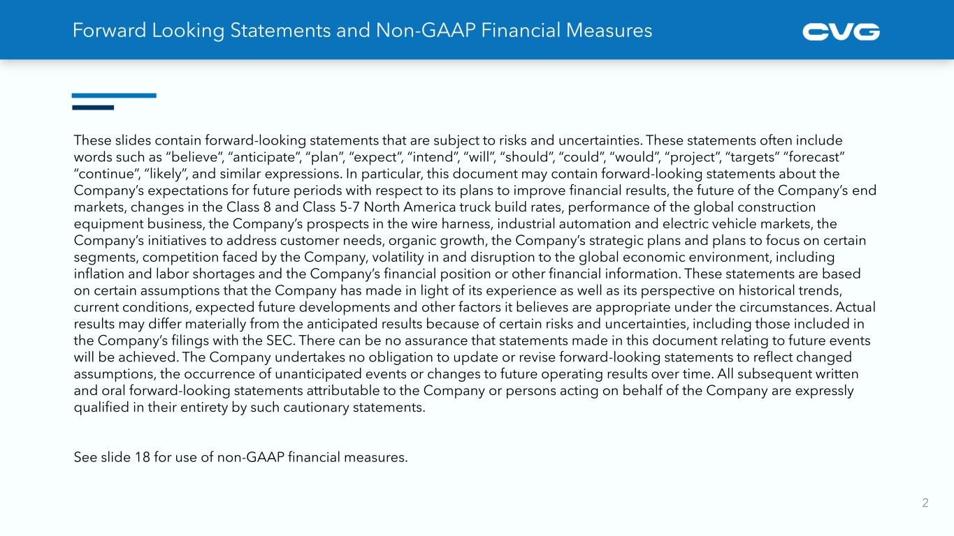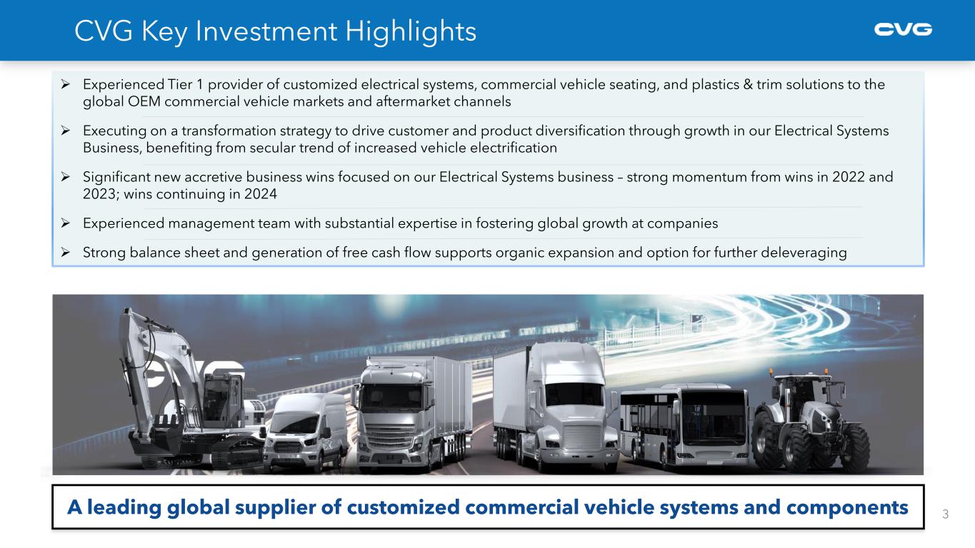 2 Forward Looking Statements and Non-GAAP Financial Measures These slides contain forward-looking statements that are subject to risks and uncertainties. These statements often include words such as “believe”, “anticipate”, “plan”, “expect”, “intend”, “will”, “should”, “could”, “would”, “project”, “targets” “forecast” “continue”, “likely”, and similar expressions. In particular, this document may contain forward-looking statements about the Company’s expectations for future periods with respect to its plans to improve financial results, the future of the Company’s end markets, changes in the Class 8 and Class 5-7 North America truck build rates, performance of the global construction equipment business, the Company’s prospects in the wire harness, industrial automation and electric vehicle markets, the Company’s initiatives to address customer needs, organic growth, the Company’s strategic plans and plans to focus on certain segments, competition faced by the Company, volatility in and disruption to the global economic environment, including inflation and labor shortages and the Company’s financial position or other financial information. These statements are based on certain assumptions that the Company has made in light of its experience as well as its perspective on historical trends, current conditions, expected future developments and other factors it believes are appropriate under the circumstances. Actual results may differ materially from the anticipated results because of certain risks and uncertainties, including those included in the Company’s filings with the SEC. There can be no assurance that statements made in this document relating to future events will be achieved. The Company undertakes no obligation to update or revise forward-looking statements to reflect changed assumptions, the occurrence of unanticipated events or changes to future operating results over time. All subsequent written and oral forward-looking statements attributable to the Company or persons acting on behalf of the Company are expressly qualified in their entirety by such cautionary statements. See slide 18 for use of non-GAAP financial measures.