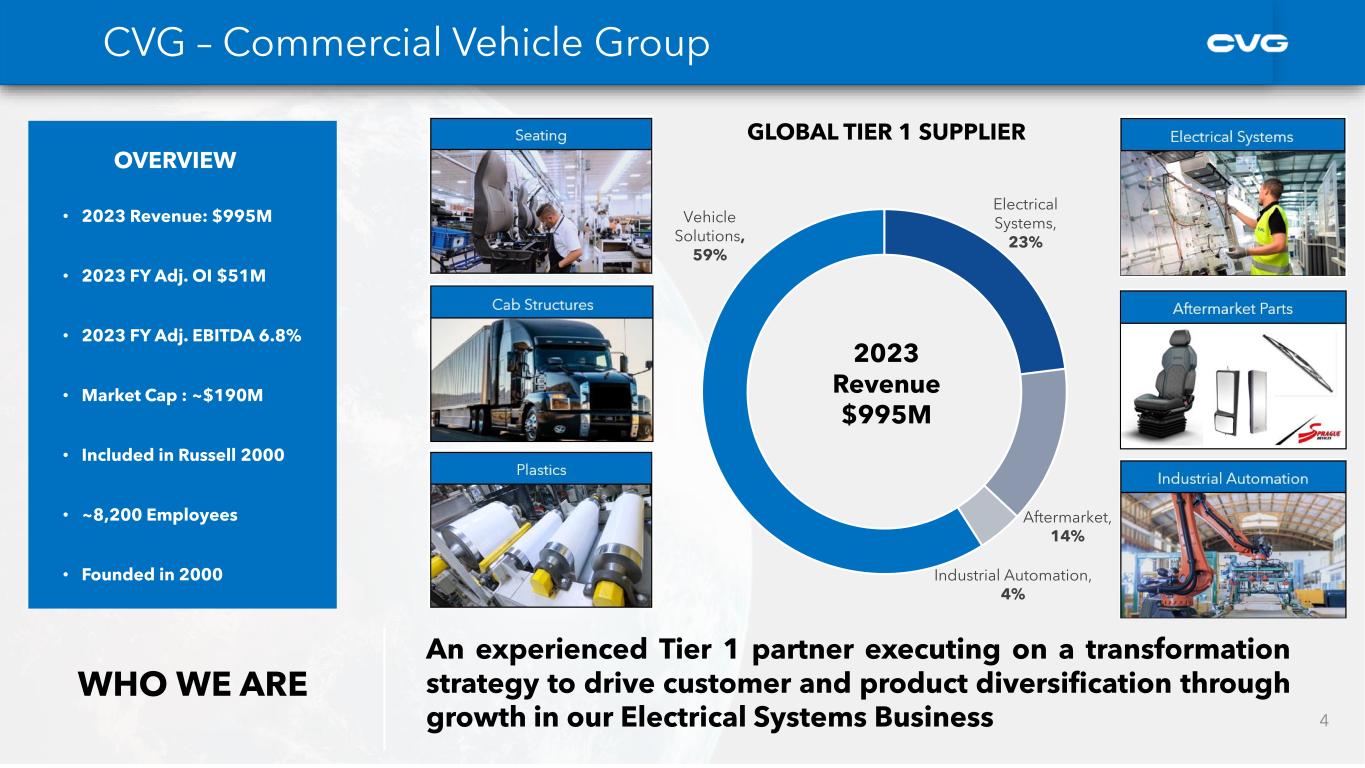 ➢ Experienced Tier 1 provider of customized electrical systems, commercial vehicle seating, and plastics & trim solutions to the global OEM commercial vehicle markets and aftermarket channels ➢ Executing on a transformation strategy to drive customer and product diversification through growth in our Electrical Systems Business, benefiting from secular trend of increased vehicle electrification ➢ Significant new accretive business wins focused on our Electrical Systems business – strong momentum from wins in 2022 and 2023; wins continuing in 2024 ➢ Experienced management team with substantial expertise in fostering global growth at companies ➢ Strong balance sheet and generation of free cash flow supports organic expansion and option for further deleveraging 3 CVG Key Investment Highlights A leading global supplier of customized commercial vehicle systems and components