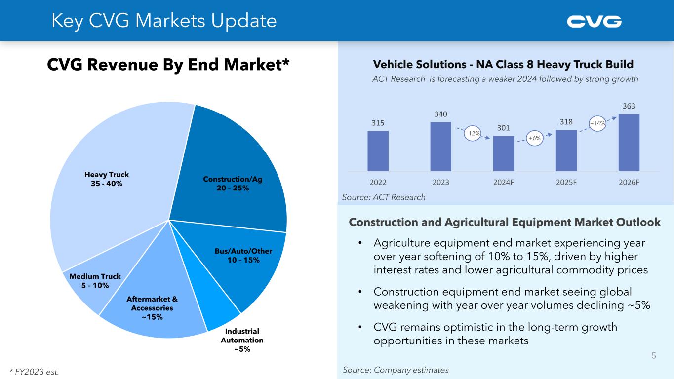 Electrical Systems, 23% Aftermarket, 14% Industrial Automation, 4% Vehicle Solutions, 59% 4 CVG Overview– Commercial Vehicle Group An experienced Tier 1 partner executing on a transformation strategy to drive customer and product diversification through growth in our Electrical Systems Business GLOBAL TIER 1 SUPPLIER • 2023 Revenue: $995M • 2023 FY Adj. OI $51M • 2023 FY Adj. EBITDA 6.8% • Market Cap : ~$190M • Included in Russell 2000 • ~8,200 Employees • Founded in 2000 WHO WE ARE OVERVIEW 2023 Revenue $995M