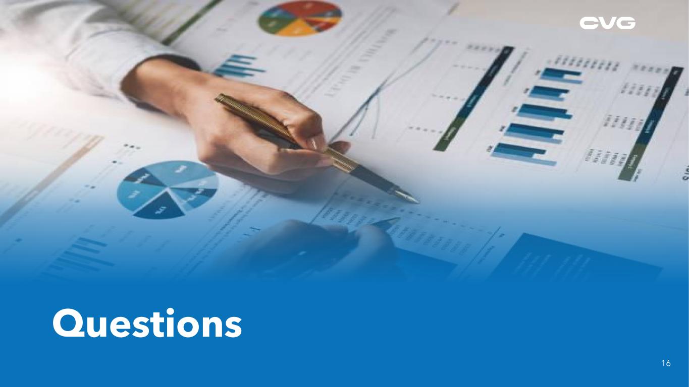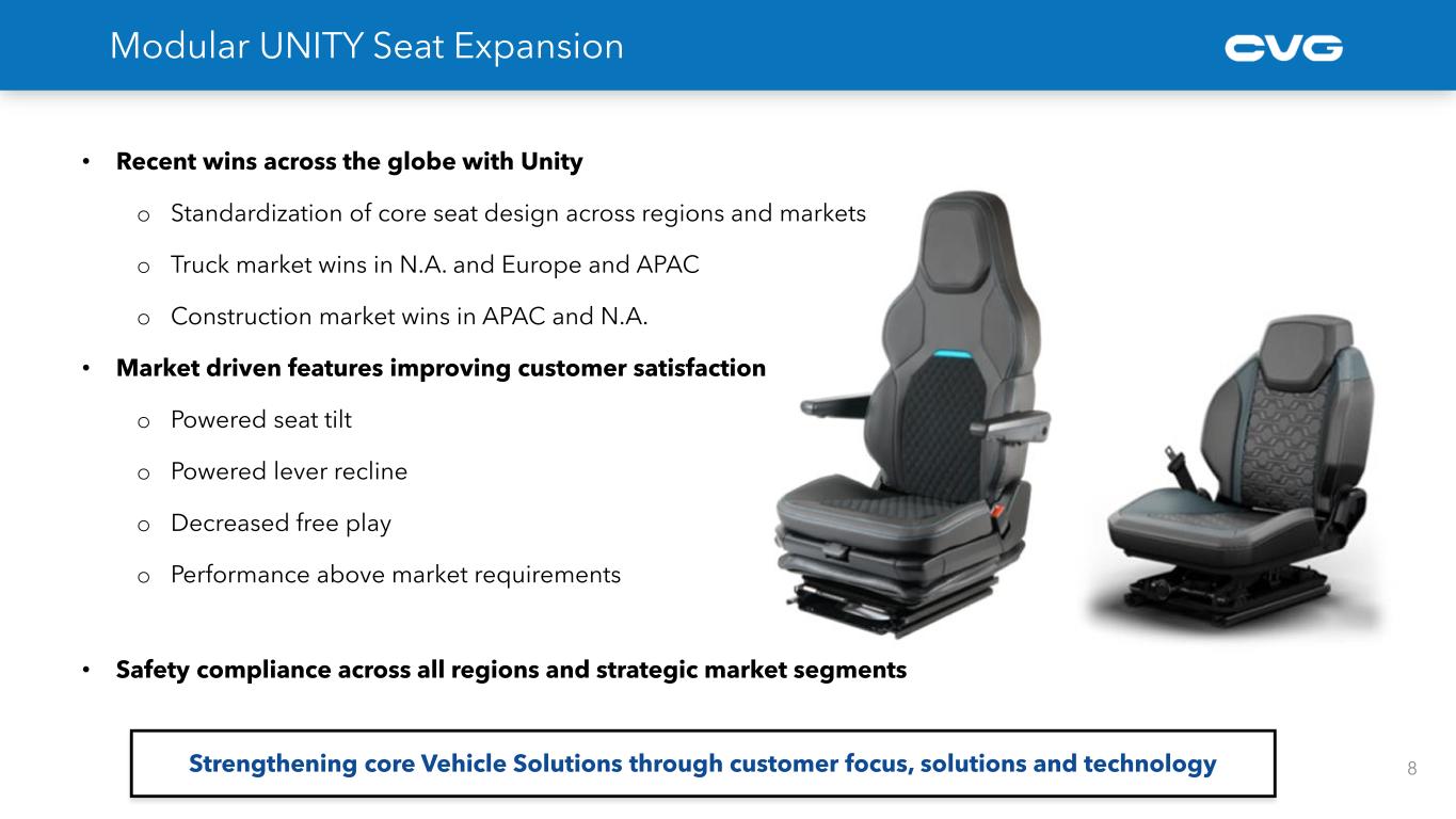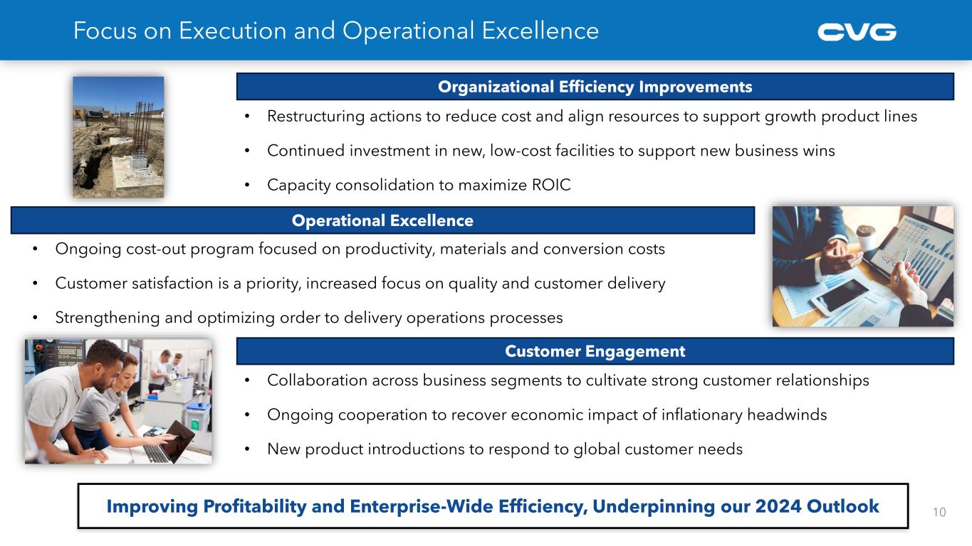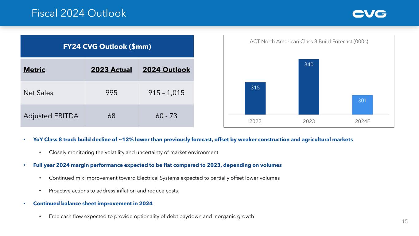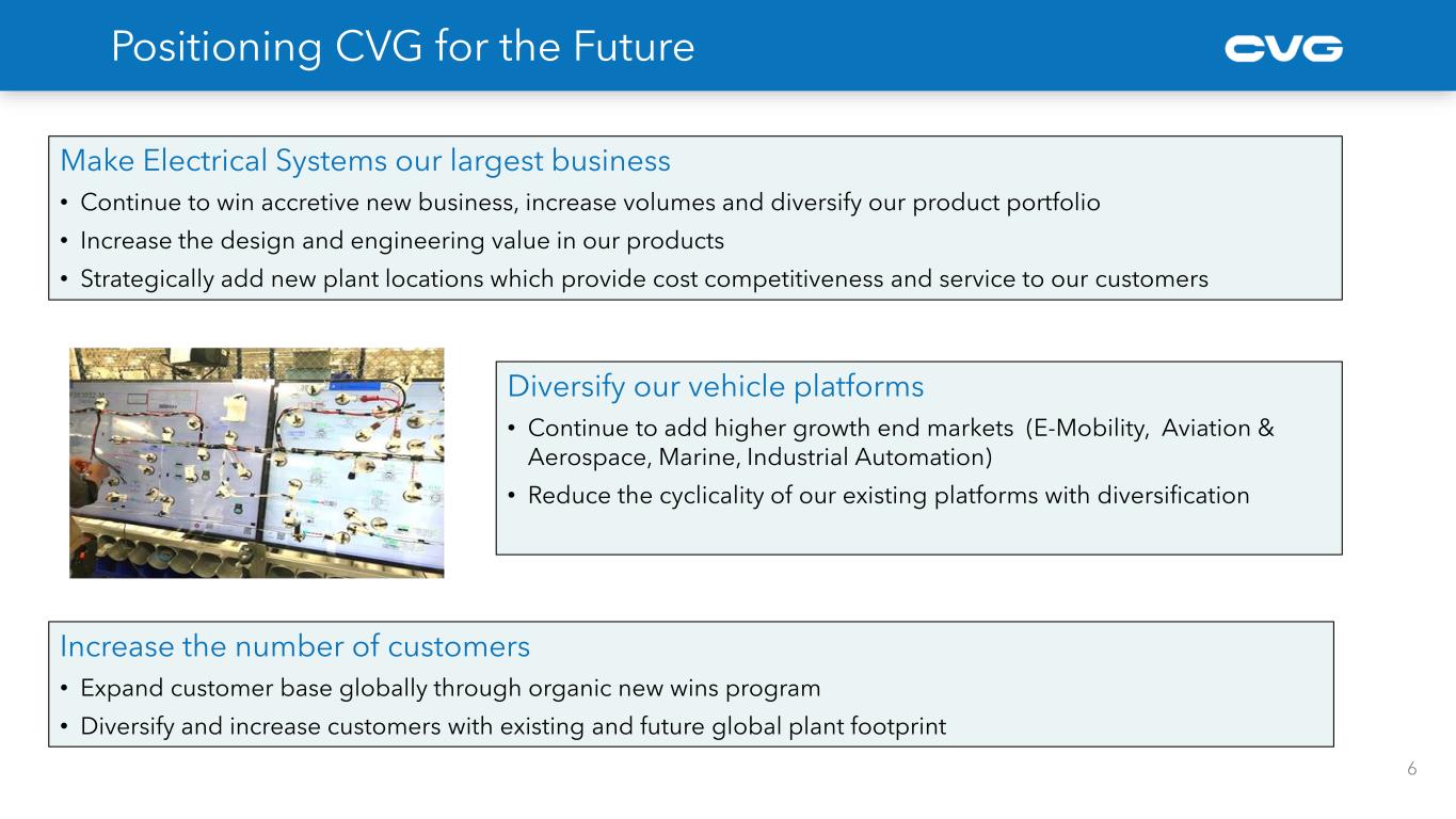 • Agriculture equipment end market experiencing year over year softening of 10% to 15%, driven by higher interest rates and lower agricultural commodity prices • Construction equipment end market seeing global weakening with year over year volumes declining ~5% • CVG remains optimistic in the long-term growth opportunities in these markets 315 340 301 318 363 2022 2023 2024F 2025F 2026F Vehicle Solutions - NA Class 8 Heavy Truck Build 5 Construction/Ag 20 – 25% Bus/Auto/Other 10 – 15% Industrial Automation ~5% Aftermarket & Accessories ~15% Medium Truck 5 – 10% Heavy Truck 35 - 40% CVG Revenue By End Market* Key CVG Markets Update ACT Research is forecasting a weaker 2024 followed by strong growth Source: ACT Research Construction and Agricultural Equipment Market Outlook Source: Company estimates* FY2023 est. -12% +6% +14%