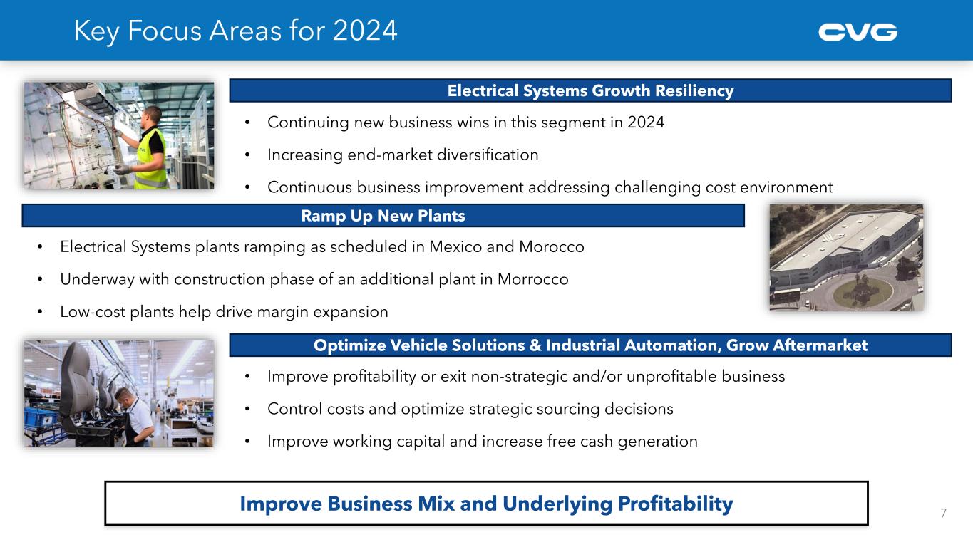 6 Positioning CVG for the Future Make Electrical Systems our largest business • Continue to win accretive new business, increase volumes and diversify our product portfolio • Increase the design and engineering value in our products • Strategically add new plant locations which provide cost competitiveness and service to our customers Diversify our vehicle platforms • Continue to add higher growth end markets (E-Mobility, Aviation & Aerospace, Marine, Industrial Automation) • Reduce the cyclicality of our existing platforms with diversification Increase the number of customers • Expand customer base globally through organic new wins program • Diversify and increase customers with existing and future global plant footprint