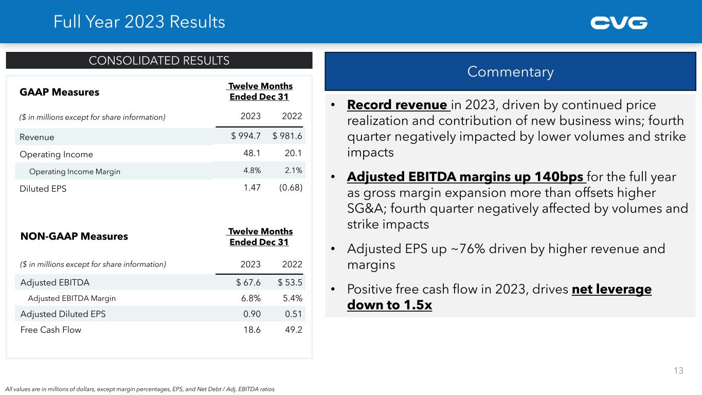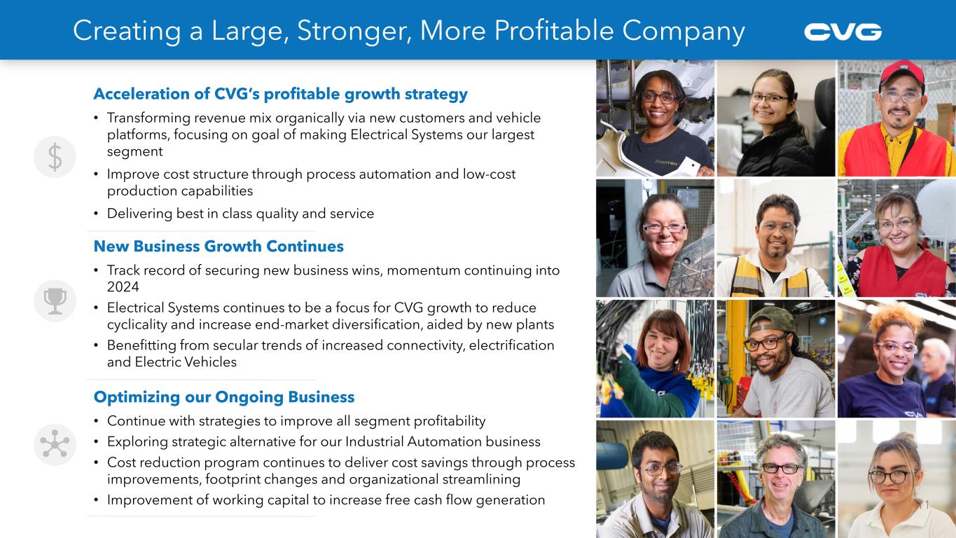 11 Creating a Large, Stronger, More Profitable Company New Business Growth Continues • Track record of securing new business wins, momentum continuing into 2024 • Electrical Systems continues to be a focus for CVG growth to reduce cyclicality and increase end-market diversification, aided by new plants • Benefitting from secular trends of increased connectivity, electrification and Electric Vehicles Optimizing our Ongoing Business • Continue with strategies to improve all segment profitability • Exploring strategic alternative for our Industrial Automation business • Cost reduction program continues to deliver cost savings through process improvements, footprint changes and organizational streamlining • Improvement of working capital to increase free cash flow generation Acceleration of CVG’s profitable growth strategy • Transforming revenue mix organically via new customers and vehicle platforms, focusing on goal of making Electrical Systems our largest segment • Improve cost structure through process automation and low-cost production capabilities • Delivering best in class quality and service