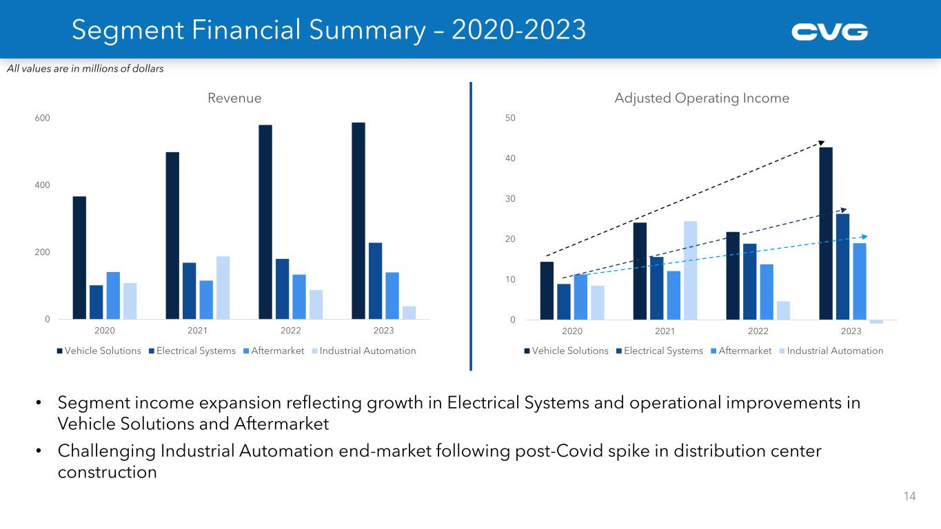 • Segment income expansion reflecting growth in Electrical Systems and operational improvements in Vehicle Solutions and Aftermarket • Challenging Industrial Automation end-market following post-Covid spike in distribution center construction All values are in millions of dollars Segment Financial Summary – 2020-2023 0 200 400 600 2020 2021 2022 2023 Revenue Vehicle Solutions Electrical Systems Aftermarket Industrial Automation (10) 0 10 20 30 40 50 2020 2021 2022 2023 Adjusted Operating Income Vehicle Solutions Electrical Systems Aftermarket Industrial Automation