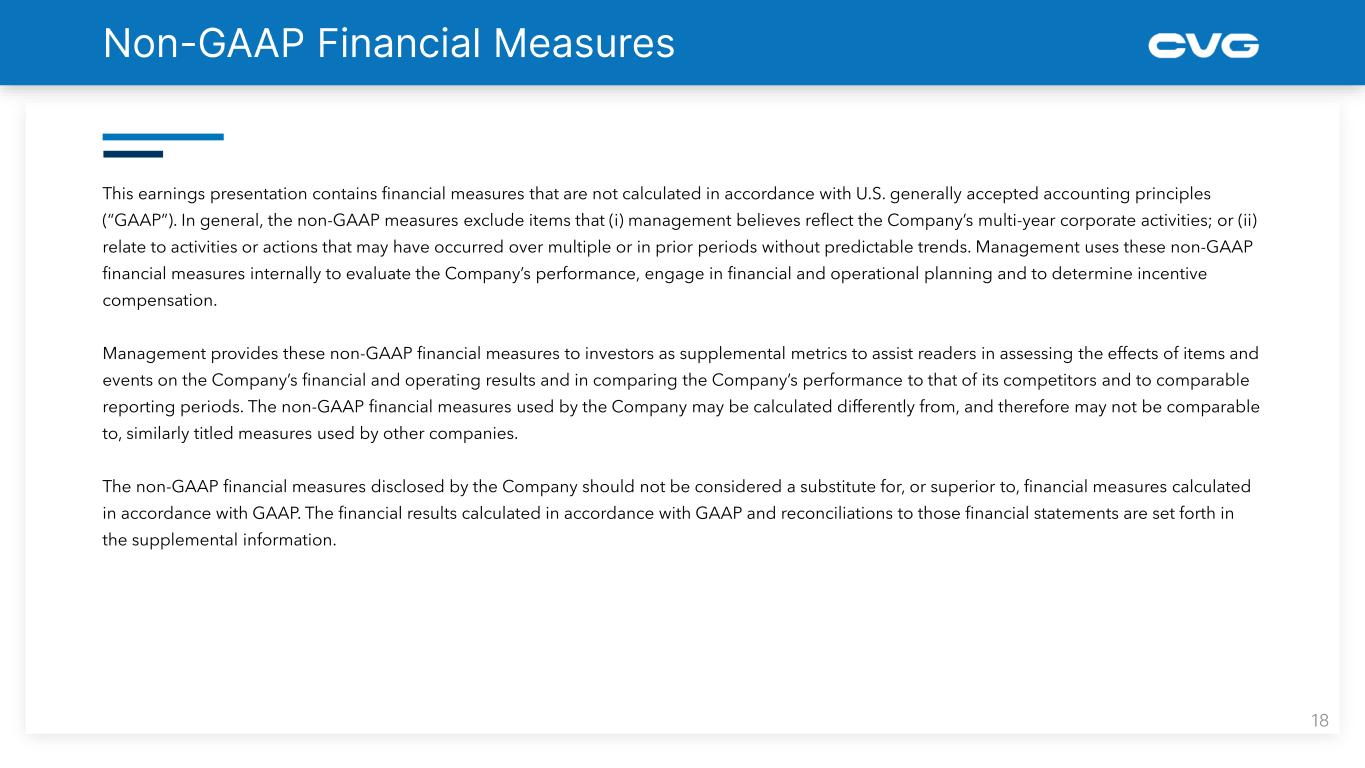 This earnings presentation contains financial measures that are not calculated in accordance with U.S. generally accepted accounting principles (“GAAP”). In general, the non-GAAP measures exclude items that (i) management believes reflect the Company’s multi-year corporate activities; or (ii) relate to activities or actions that may have occurred over multiple or in prior periods without predictable trends. Management uses these non-GAAP financial measures internally to evaluate the Company’s performance, engage in financial and operational planning and to determine incentive compensation. Management provides these non-GAAP financial measures to investors as supplemental metrics to assist readers in assessing the effects of items and events on the Company’s financial and operating results and in comparing the Company’s performance to that of its competitors and to comparable reporting periods. The non-GAAP financial measures used by the Company may be calculated differently from, and therefore may not be comparable to, similarly titled measures used by other companies. The non-GAAP financial measures disclosed by the Company should not be considered a substitute for, or superior to, financial measures calculated in accordance with GAAP. The financial results calculated in accordance with GAAP and reconciliations to those financial statements are set forth in the supplemental information.