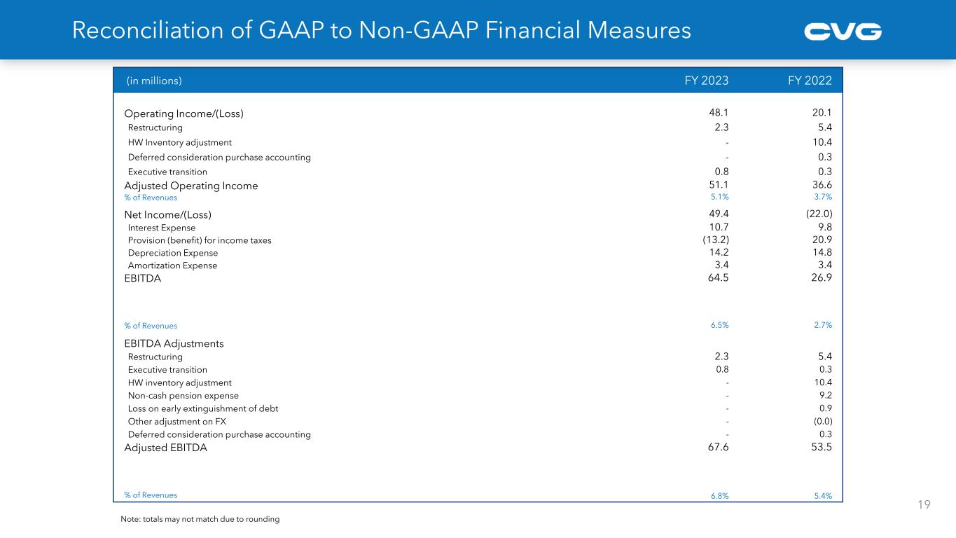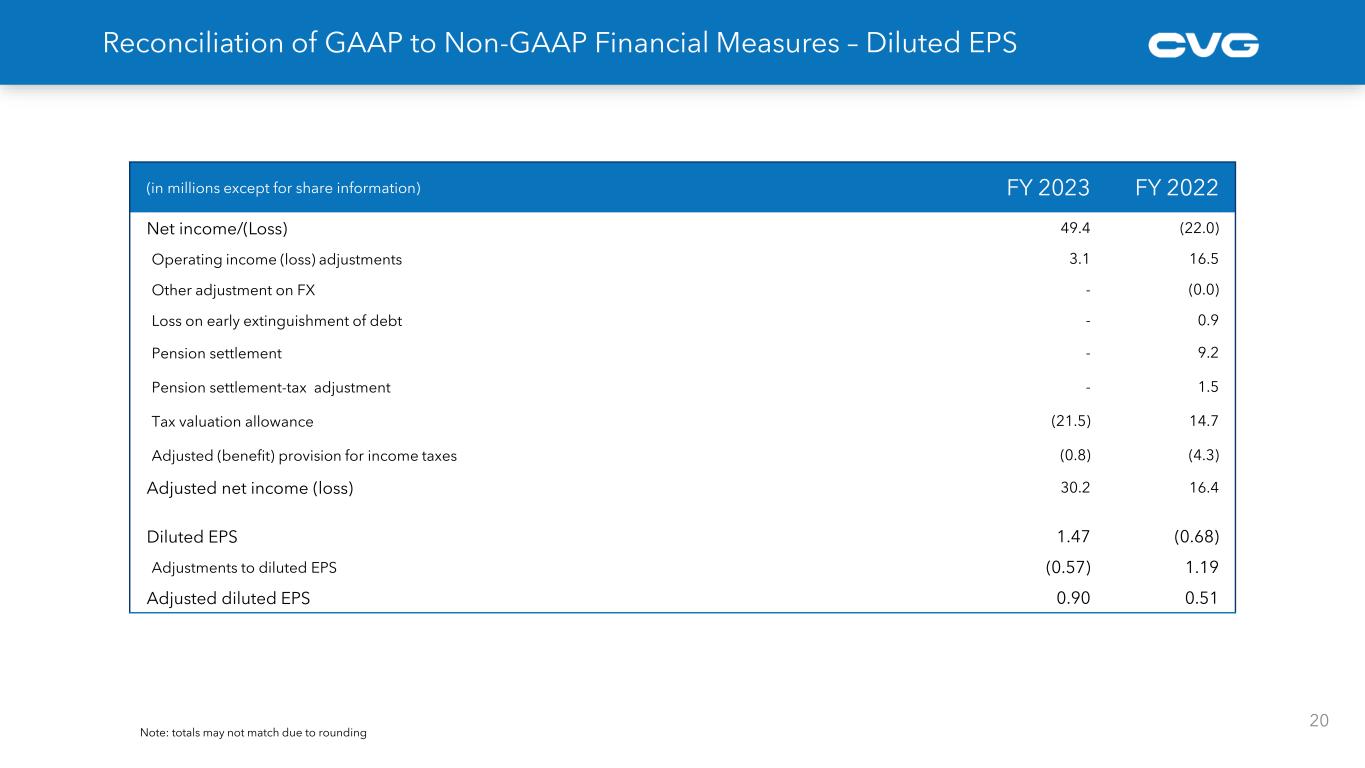 (in millions) FY 2023 FY 2022 Operating Income/(Loss) 48.1 20.1 Restructuring 2.3 5.4 HW Inventory adjustment - 10.4 Deferred consideration purchase accounting - 0.3 Executive transition 0.8 0.3 Adjusted Operating Income 51.1 36.6 % of Revenues 5.1% 3.7% Net Income/(Loss) 49.4 (22.0) Interest Expense 10.7 9.8 Provision (benefit) for income taxes (13.2) 20.9 Depreciation Expense 14.2 14.8 Amortization Expense 3.4 3.4 EBITDA 64.5 26.9 % of Revenues 6.5% 2.7% EBITDA Adjustments Restructuring 2.3 5.4 Executive transition 0.8 0.3 HW inventory adjustment - 10.4 Non-cash pension expense - 9.2 Loss on early extinguishment of debt - 0.9 Other adjustment on FX - (0.0) Deferred consideration purchase accounting - 0.3 Adjusted EBITDA 67.6 53.5 % of Revenues 6.8% 5.4% 19 Reconciliation of GAAP to Non-GAAP Financial Measures Note: totals may not match due to rounding