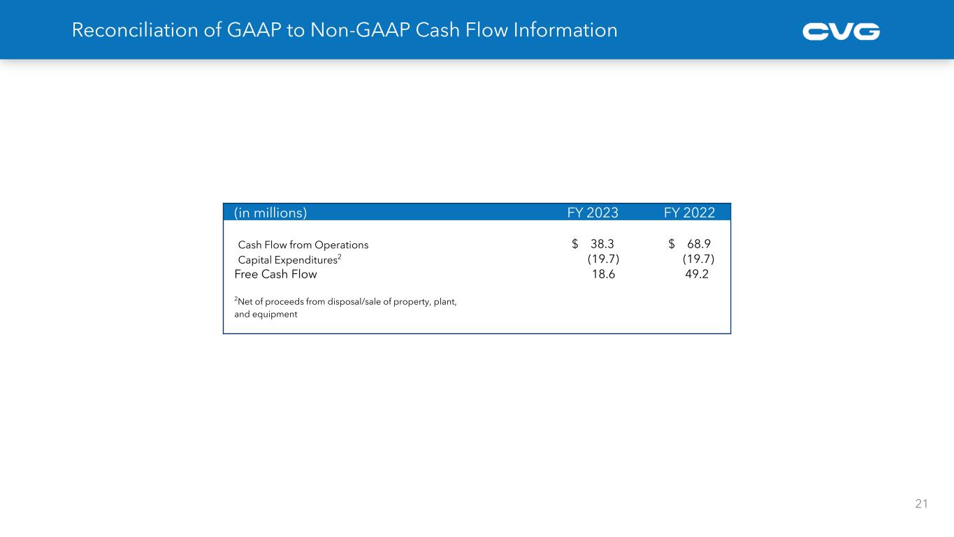 (in millions except for share information) FY 2023 FY 2022 Net income/(Loss) 49.4 (22.0) Operating income (loss) adjustments 3.1 16.5 Other adjustment on FX - (0.0) Loss on early extinguishment of debt - 0.9 Pension settlement - 9.2 Pension settlement-tax adjustment - 1.5 Tax valuation allowance (21.5) 14.7 Adjusted (benefit) provision for income taxes (0.8) (4.3) Adjusted net income (loss) 30.2 16.4 Diluted EPS 1.47 (0.68) Adjustments to diluted EPS (0.57) 1.19 Adjusted diluted EPS 0.90 0.51 20 Reconciliation of GAAP to Non-GAAP Financial Measures – Diluted EPS Note: totals may not match due to rounding