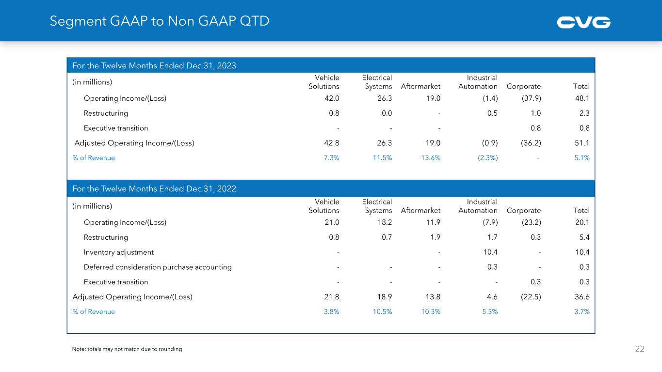Segment GAAP to Non GAAP QTD For the Twelve Months Ended Dec 31, 2021 (in millions) Vehicle Solutions Electrical Systems Aftermarket Industrial Automation Corporate Total Operating Income/(Loss) 23.6 14.6 12.1 23.6 (24.3) 49.6 Deferred consideration purchase accounting - - - 0.6 - 0.6 Executive Transitioning - - - - 0.7 0.7 Restructuring 0.5 1.0 - 0.3 0.1 1.9 Investigation - - - - 0.4 0.4 Adjusted Operating Income/(Loss) 24.1 15.6 12.1 24.5 (23.1) 53.2 % of Revenue 4.8% 9.2% 10.4% 13.1% 5.5% For the Twelve Months Ended Dec 31, 2020 (in millions) Vehicle Solutions Electrical Systems Aftermarket Industrial Automation Corporate Total Operating Income/(Loss) 2.6 7.0 11.3 (16.3) (27.8) (23.2) Deferred consideration purchase accounting - - - 5.0 - 5.0 Executive Transitioning - - - - 2.2 2.2 Restructuring 4.5 0.7 0.1 - 1.6 6.9 Investigation - - - - 4.0 4.0 Impairment 7.3 1.2 - 19.8 0.8 29.1 Adjusted Operating Income/(Loss) 14.4 8.9 11.3 8.5 (19.2) 23.9 % of Revenue 3.9% 6.3% 10.5% 8.3% 3.3% Note: totals may not match due to rounding