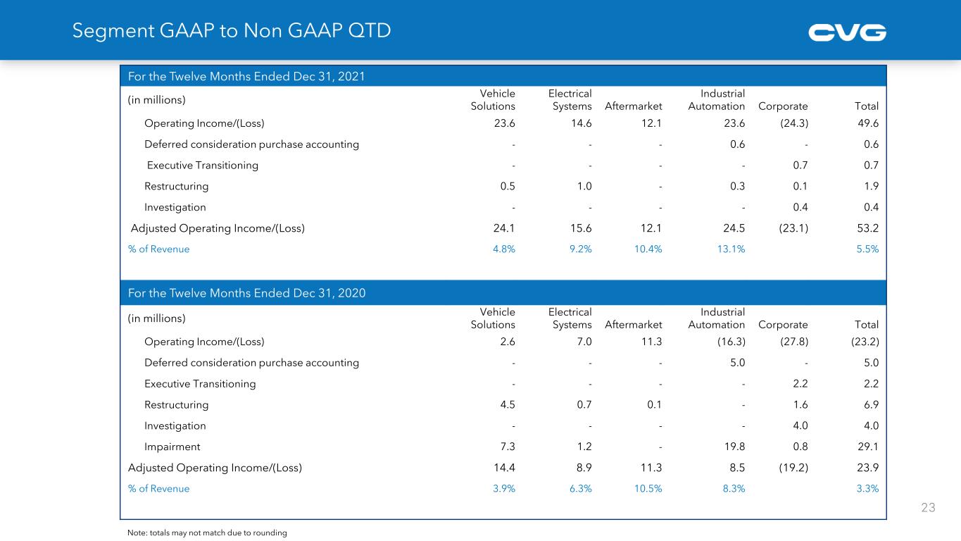 Segment GAAP to Non GAAP QTD For the Twelve Months Ended Dec 31, 2023 (in millions) Vehicle Solutions Electrical Systems Aftermarket Industrial Automation Corporate Total Operating Income/(Loss) 42.0 26.3 19.0 (1.4) (37.9) 48.1 Restructuring 0.8 0.0 - 0.5 1.0 2.3 Executive transition - - - 0.8 0.8 Adjusted Operating Income/(Loss) 42.8 26.3 19.0 (0.9) (36.2) 51.1 % of Revenue 7.3% 11.5% 13.6% (2.3%) - 5.1% For the Twelve Months Ended Dec 31, 2022 (in millions) Vehicle Solutions Electrical Systems Aftermarket Industrial Automation Corporate Total Operating Income/(Loss) 21.0 18.2 11.9 (7.9) (23.2) 20.1 Restructuring 0.8 0.7 1.9 1.7 0.3 5.4 Inventory adjustment - - 10.4 - 10.4 Deferred consideration purchase accounting - - - 0.3 - 0.3 Executive transition - - - - 0.3 0.3 Adjusted Operating Income/(Loss) 21.8 18.9 13.8 4.6 (22.5) 36.6 % of Revenue 3.8% 10.5% 10.3% 5.3% 3.7% 22Note: totals may not match due to rounding