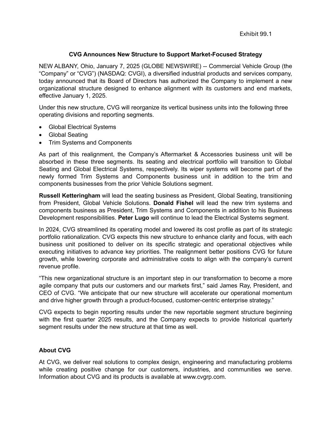CVG Announces New Structure to Support Market-Focused Strategy NEW ALBANY, Ohio, January 7, 2025 (GLOBE NEWSWIRE) -- Commercial Vehicle Group (the “Company” or “CVG”) (NASDAQ: CVGI), a diversified industrial products and services company, today announced that its Board of Directors has authorized the Company to implement a new organizational structure designed to enhance alignment with its customers and end markets, effective January 1, 2025. Under this new structure, CVG will reorganize its vertical business units into the following three operating divisions and reporting segments. • Global Electrical Systems • Global Seating • Trim Systems and Components As part of this realignment, the Company’s Aftermarket & Accessories business unit will be absorbed in these three segments. Its seating and electrical portfolio will transition to Global Seating and Global Electrical Systems, respectively. Its wiper systems will become part of the newly formed Trim Systems and Components business unit in addition to the trim and components businesses from the prior Vehicle Solutions segment. Russell Ketteringham will lead the seating business as President, Global Seating, transitioning from President, Global Vehicle Solutions. Donald Fishel will lead the new trim systems and components business as President, Trim Systems and Components in addition to his Business Development responsibilities. Peter Lugo will continue to lead the Electrical Systems segment. In 2024, CVG streamlined its operating model and lowered its cost profile as part of its strategic portfolio rationalization. CVG expects this new structure to enhance clarity and focus, with each business unit positioned to deliver on its specific strategic and operational objectives while executing initiatives to advance key priorities. The realignment better positions CVG for future growth, while lowering corporate and administrative costs to align with the company’s current revenue profile. “This new organizational structure is an important step in our transformation to become a more agile company that puts our customers and our markets first,” said James Ray, President, and CEO of CVG. “We anticipate that our new structure will accelerate our operational momentum and drive higher growth through a product-focused, customer-centric enterprise strategy.” CVG expects to begin reporting results under the new reportable segment structure beginning with the first quarter 2025 results, and the Company expects to provide historical quarterly segment results under the new structure at that time as well. About CVG At CVG, we deliver real solutions to complex design, engineering and manufacturing problems while creating positive change for our customers, industries, and communities we serve. Information about CVG and its products is available at www.cvgrp.com. Exhibit 99.1