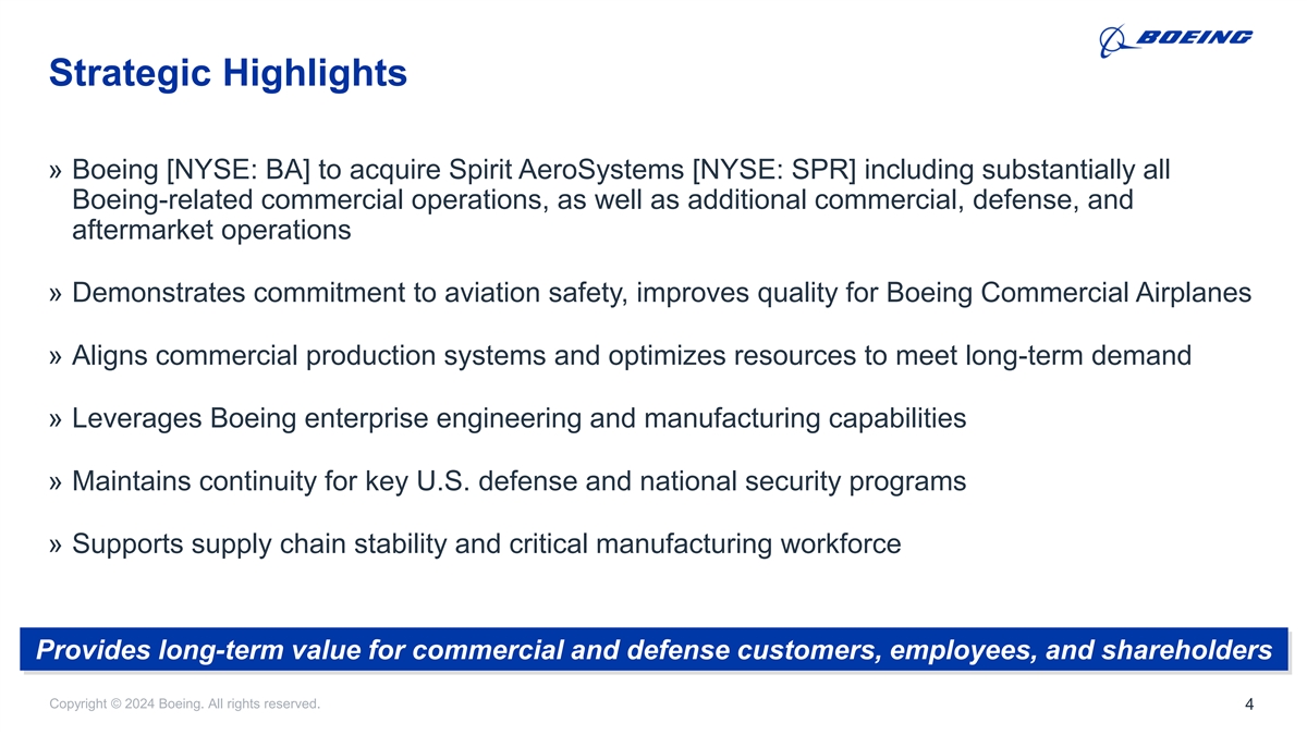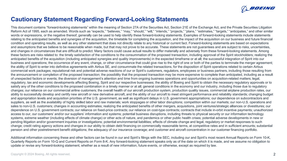 Additional Information and Where to Find It Boeing will file with the U.S. Securities and Exchange Commission (SEC) a registration statement on Form S-4, which will include a proxy statement of Spirit that also constitutes a prospectus of Boeing, and any other documents in connection with the transaction. The definitive proxy statement/prospectus will be sent to the holders of common stock of Spirit. INVESTORS AND SHAREHOLDERS OF SPIRIT AND BOEING ARE URGED TO READ THE PROXY STATEMENT/PROSPECTUS AND ANY OTHER DOCUMENTS FILED OR TO BE FILED WITH THE SEC IN CONNECTION WITH THE TRANSACTION WHEN THEY BECOME AVAILABLE, AS THEY WILL CONTAIN IMPORTANT INFORMATION ABOUT BOEING, SPIRIT, THE TRANSACTION AND RELATED MATTERS. The registration statement and proxy statement/prospectus and other documents filed by Boeing or Spirit with the SEC, when filed, will be available free of charge at the SEC’s website at www.sec.gov. Alternatively, investors and stockholders may obtain free copies of documents that are filed or will be filed with the SEC by Boeing, including the registration statement and the proxy statement/prospectus, on Boeing’s website at www.boeing.com/investors, and may obtain free copies of documents that are filed or will be filed with the SEC by Spirit, including the proxy statement/prospectus, on Spirit’s website at https://investor.spiritaero.com/corporate- profile/default.aspx. The information included on, or accessible through, Boeing’s or Spirit’s website is not incorporated by reference into this document. No Offer or Solicitation This document is not intended to and shall not constitute an offer to sell or the solicitation of an offer to buy any securities, nor shall there be any sale of securities in any jurisdiction in which such offer, solicitation or sale would be unlawful prior to appropriate registration or qualification under the securities laws of such jurisdiction. No offering of securities shall be made except by means of a prospectus meeting the requirements of Section 10 of the Securities Act of 1933, as amended. Participants in the Solicitation Boeing and certain of its directors, executive officers and other employees, and Spirit and its directors and certain of Spirit’s, executive officers and other employees, may be deemed to be participants in the solicitation of proxies from Spirit’s stockholders in connection with the proposed transaction. A description of participants’ direct or indirect interests, by security holdings or otherwise, will be included in the proxy statement/prospectus relating to the proposed transaction when it is filed with the SEC. Information regarding Boeing’s directors and executive officers is contained in the “Proxy Summary – Leadership Changes,” “Election of Directors (Item 1),” “Corporate Governance,” “Compensation Discussion and Analysis,” “Compensation of Executive Officers” and “Stock Ownership Information” sections of the definitive proxy statement for Boeing’s 2024 annual meeting of shareholders, filed with the SEC on April 5, 2024, in Item 10 of Boeing’s Annual Report on Form 10-K for the fiscal year ended December 31, 2023, filed with the SEC on January 31, 2024, in Boeing’s Current Reports on Form 8-K filed with the SEC on December 11, 2023, March 25, 2024, and May 17, 2024, and in Boeing’s February 22, 2024 press release, available on Boeing’s investor relations website at www.boeing.com/investors, relating to the appointment of a new Chief Human Resources Officer. Information regarding Spirit’s directors and executive officers is contained in the “Proposal 1 – Election of Directors,” “Corporate Governance,” “Director Compensation,” “Stock Ownership” and “Compensation Discussion and Analysis” sections of Spirit’s definitive proxy statement for its 2024 annual meeting of stockholders, filed with the SEC on March 12, 2024, under the heading “Executive Officers of the Registrant” in Part I of Spirit’s Annual Report on Form 10-K for the fiscal year ended December 31, 2023, filed with the SEC on February 22, 2024, in Item 5.07 of Spirit’s Current Report on Form 8-K filed with the SEC on April 29, 2024, and in Spirit’s Current Report on Form 8-K filed with the SEC on June 5, 2024. Additional information regarding ownership of Boeing’s securities by its directors and executive officers and of Spirit’s securities by its directors and executive officers is included in such persons’ SEC filings on Forms 3 and 4. These documents and the other SEC filings described in this paragraph may be obtained free of charge as described above under the heading “Additional Information and Where to Find It.” Copyright © 2024 Boeing. All rights reserved. 3