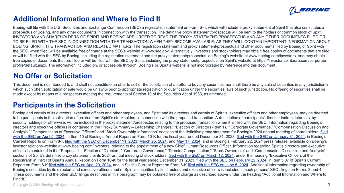 Cautionary Statement Regarding Forward-Looking Statements This document contains “forward-looking statements” within the meaning of Section 27A of the Securities Act, Section 21E of the Exchange Act, and the Private Securities Litigation Reform Act of 1995, each as amended. Words such as “expects,” “believes,” “may,” “should,” “will,” “intends,” “projects,” “plans,” “estimates,” “targets,” “anticipates,” and other similar words or expressions, or the negative thereof, generally can be used to help identify these forward-looking statements. Examples of forward-looking statements include statements relating to the anticipated benefits and synergies of the acquisition, the timetable for completing the acquisition, and the impact of the acquisition on our business and future financial condition and operating results, as well as any other statement that does not directly relate to any historical or current fact. Forward-looking statements are based on expectations and assumptions that we believe to be reasonable when made, but that may not prove to be accurate. These statements are not guarantees and are subject to risks, uncertainties, and changes in circumstances that are difficult to predict. Many factors could cause actual results to differ materially and adversely from these forward-looking statements. Among these factors are risks related to: the timely satisfaction of the conditions to the consummation of the proposed transaction, including approval of the Spirit stockholders; realizing the anticipated benefits of the acquisition (including anticipated synergies and quality improvements) in the expected timeframe or at all; the successful integration of Spirit into our business and operations; the occurrence of any event, change, or other circumstance that could give rise to the right of one or both of the parties to terminate the merger agreement; the ability of Spirit to enter into definitive agreements with Airbus SE, and consummate the related transactions, for the disposition of Spirit operations related to certain Airbus commercial work packages; reputational risk and potential adverse reactions of our or Spirit’s customers, regulators, employees or business partners, including those resulting from the announcement or completion of the proposed transaction; the possibility that the proposed transaction may be more expensive to complete than anticipated, including as a result of unexpected factors or events; the diversion of management’s attention and time from ongoing business operations and opportunities on acquisition-related matters; legal, regulatory, tax and economic developments affecting Boeing, Spirit and our respective businesses; the ability of Boeing and Spirit to obtain the necessary regulatory approvals or to satisfy any of the other conditions to the proposed combination in a timely manner or at all; general conditions in the economy and our industry, including those due to regulatory changes; our reliance on our commercial airline customers; the overall health of our aircraft production system, production quality issues, commercial airplane production rates, our ability to successfully develop and certify new aircraft or new derivative aircraft, and the ability of our aircraft to meet stringent performance and reliability standards; changing budget and appropriation levels and acquisition priorities of the U.S. government, as well as significant delays in U.S. government appropriations; our dependence on subcontractors and suppliers, as well as the availability of highly skilled labor and raw materials; work stoppages or other labor disruptions; competition within our markets; our non-U.S. operations and sales to non-U.S. customers; changes in accounting estimates; realizing the anticipated benefits of other mergers, acquisitions, joint ventures/strategic alliances or divestitures; our dependence on U.S. government contracts; our reliance on fixed-price contracts; our reliance on cost-type contracts; contracts that include in-orbit incentive payments; unauthorized access to our, our customers’ and/or our suppliers’ information and systems; potential business disruptions, including threats to physical security or our information technology systems, extreme weather (including effects of climate change) or other acts of nature, and pandemics or other public health crises; potential adverse developments in new or pending litigation and/or government inquiries or investigations; potential environmental liabilities; effects of climate change and legal, regulatory or market responses to such change; credit rating agency actions and changes in our ability to obtain debt financing on commercially reasonable terms, at competitive rates and in sufficient amounts; substantial pension and other postretirement benefit obligations; the adequacy of our insurance coverage; and customer and aircraft concentration in our customer financing portfolio. Additional information concerning these and other factors can be found in our and Spirit’s filings with the SEC, including our and Spirit’s most recent Annual Reports on Form 10-K, Quarterly Reports on Form 10-Q and Current Reports on Form 8-K. Any forward-looking statement speaks only as of the date on which it is made, and we assume no obligation to update or revise any forward-looking statement, whether as a result of new information, future events, or otherwise, except as required by law. Copyright © 2024 Boeing. All rights reserved. 2