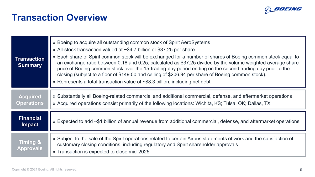 Strategic Highlights » Boeing [NYSE: BA] to acquire Spirit AeroSystems [NYSE: SPR] including substantially all Boeing-related commercial operations, as well as additional commercial, defense, and aftermarket operations » Demonstrates commitment to aviation safety, improves quality for Boeing Commercial Airplanes » Aligns commercial production systems and optimizes resources to meet long-term demand » Leverages Boeing enterprise engineering and manufacturing capabilities » Maintains continuity for key U.S. defense and national security programs » Supports supply chain stability and critical manufacturing workforce Provides long-term value for commercial and defense customers, employees, and shareholders Copyright © 2024 Boeing. All rights reserved. 4