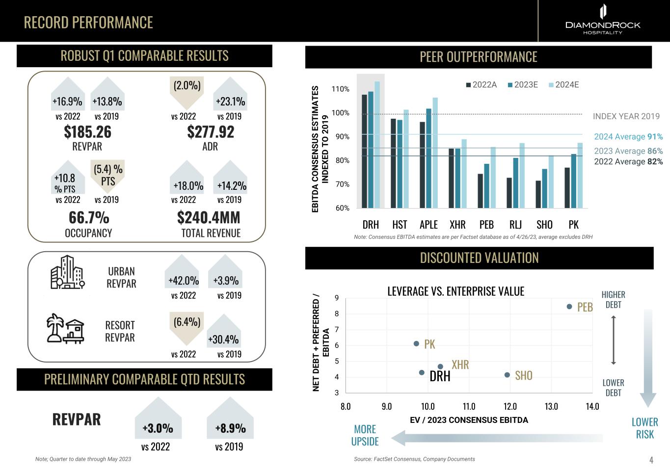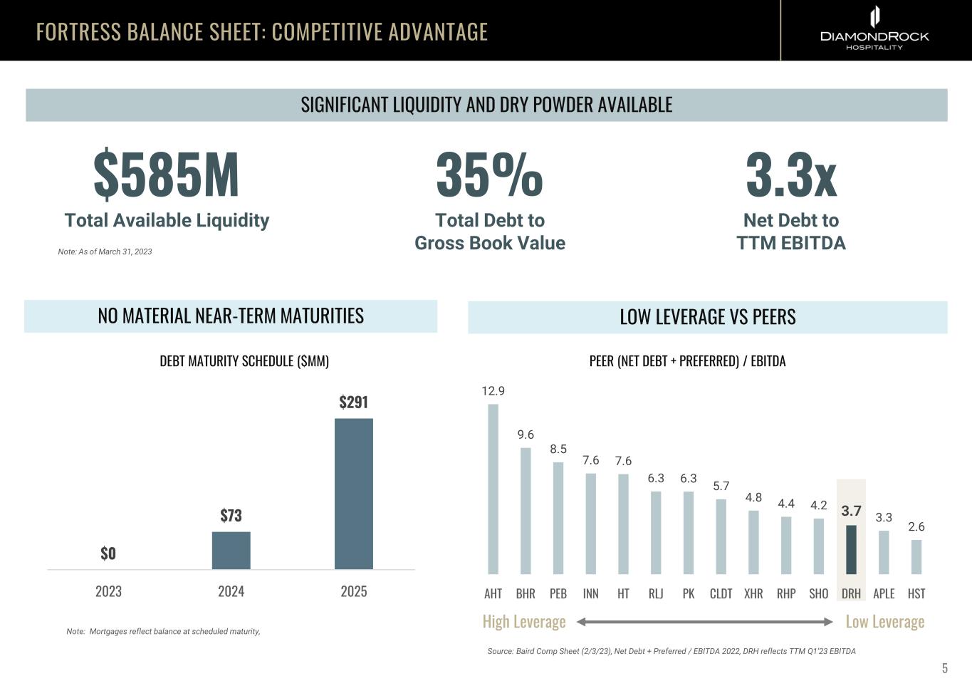 RECORD PERFORMANCE 60% 70% 80% 90% 100% 110% 120% DRH HST APLE XHR PEB RLJ SHO PK 2022A 2023E 2024E Note: Consensus EBITDA estimates are per Factset database as of 4/26/23, average excludes DRH ROBUST Q1 COMPARABLE RESULTS INDEX YEAR 2019 PEER OUTPERFORMANCE DISCOUNTED VALUATION $185.26 +16.9% REVPAR vs 2022 +13.8% vs 2019 $277.92 ADR (2.0%) vs 2022 +23.1% vs 2019 66.7% OCCUPANCY (5.4) % PTS vs 2022 +10.8 % PTS vs 2019 $240.4MM TOTAL REVENUE +18.0% vs 2022 +14.2% vs 2019 URBAN REVPAR RESORT REVPAR +42.0% vs 2022 +3.9% vs 2019 (6.4%) vs 2022 +30.4% vs 2019 2022 Average 82% 2023 Average 86% 2024 Average 91% EB IT DA C O N SE N SU S ES TI M A TE S IN DE XE D TO 2 01 9 Source: FactSet Consensus, Company Documents HIGHER DEBT LOWER DEBT DRH PEB SHO XHR PK 3 4 5 6 7 8 9 8.0 9.0 10.0 11.0 12.0 13.0 14.0 N ET D EB T + PR EF ER RE D / EB IT DA EV / 2023 CONSENSUS EBITDA LEVERAGE VS. ENTERPRISE VALUE 4 PRELIMINARY COMPARABLE QTD RESULTS LOWER RISKMORE UPSIDE REVPAR +3.0% +8.9% vs 2022 vs 2019 Note; Quarter to date through May 2023