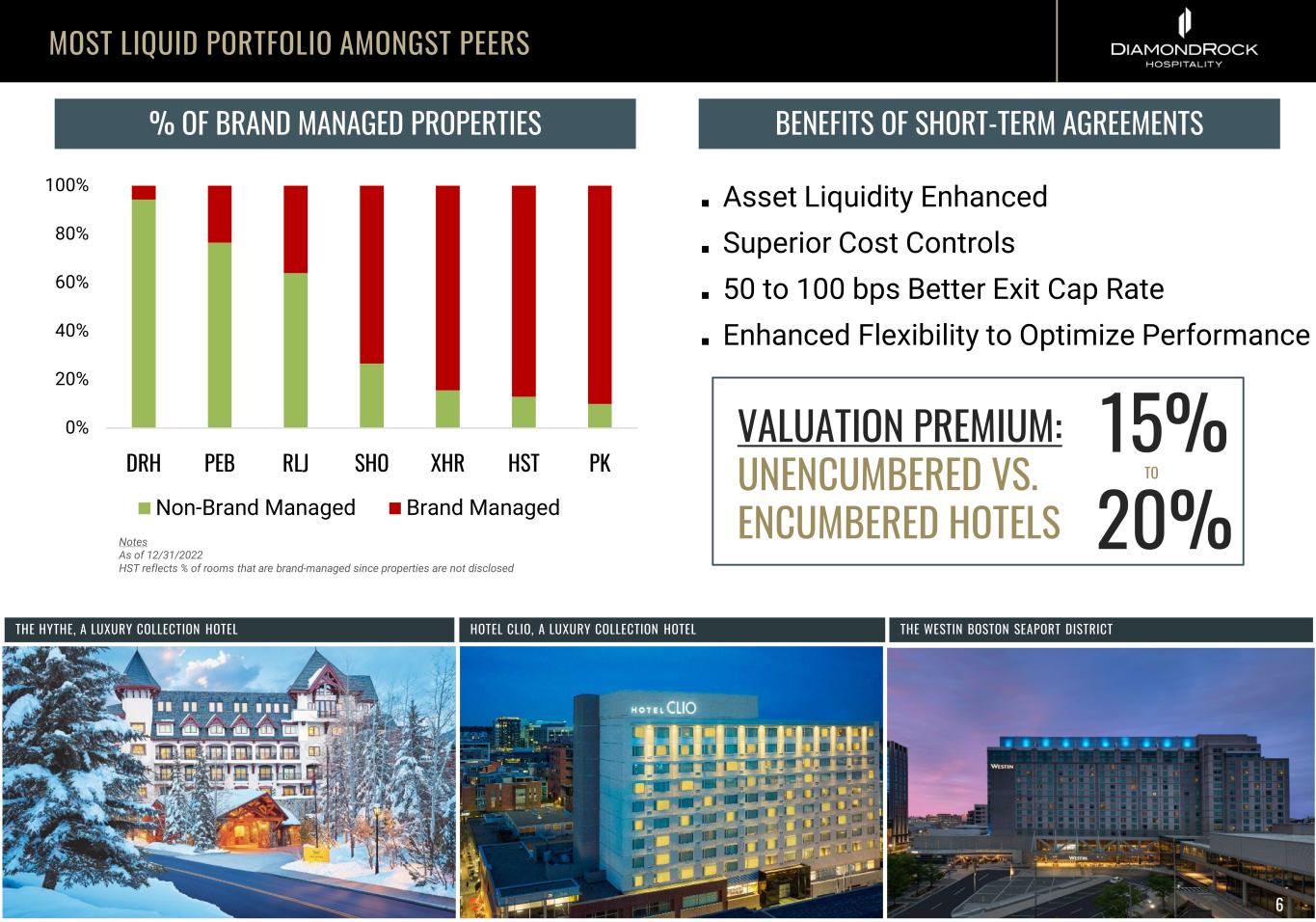 NO MATERIAL NEAR-TERM MATURITIES FORTRESS BALANCE SHEET: COMPETITIVE ADVANTAGE Note: Mortgages reflect balance at scheduled maturity, $585M Total Available Liquidity 35% Total Debt to Gross Book Value 3.3x Net Debt to TTM EBITDANote: As of March 31, 2023 LOW LEVERAGE VS PEERS Source: Baird Comp Sheet (2/3/23), Net Debt + Preferred / EBITDA 2022, DRH reflects TTM Q1’23 EBITDA PEER (NET DEBT + PREFERRED) / EBITDADEBT MATURITY SCHEDULE ($MM) SIGNIFICANT LIQUIDITY AND DRY POWDER AVAILABLE 5 12.9 9.6 8.5 7.6 7.6 6.3 6.3 5.7 4.8 4.4 4.2 3.7 3.3 2.6 AHT BHR PEB INN HT RLJ PK CLDT XHR RHP SHO DRH APLE HST $0 $73 $291 2023 2024 2025 High Leverage Low Leverage