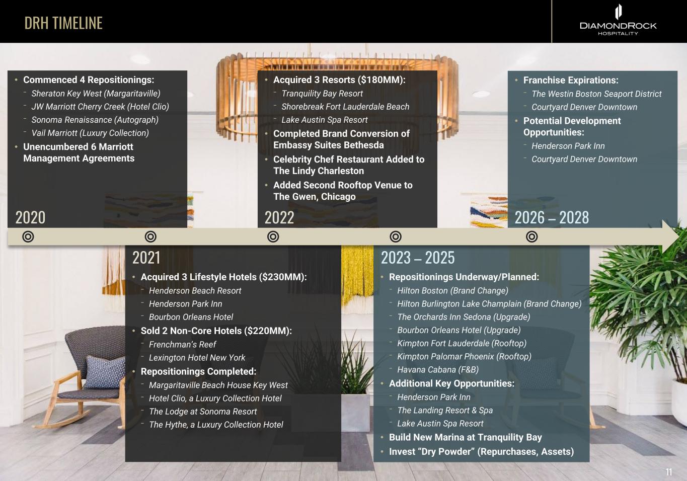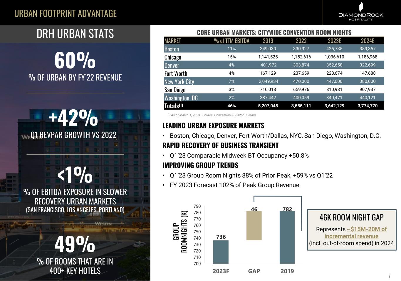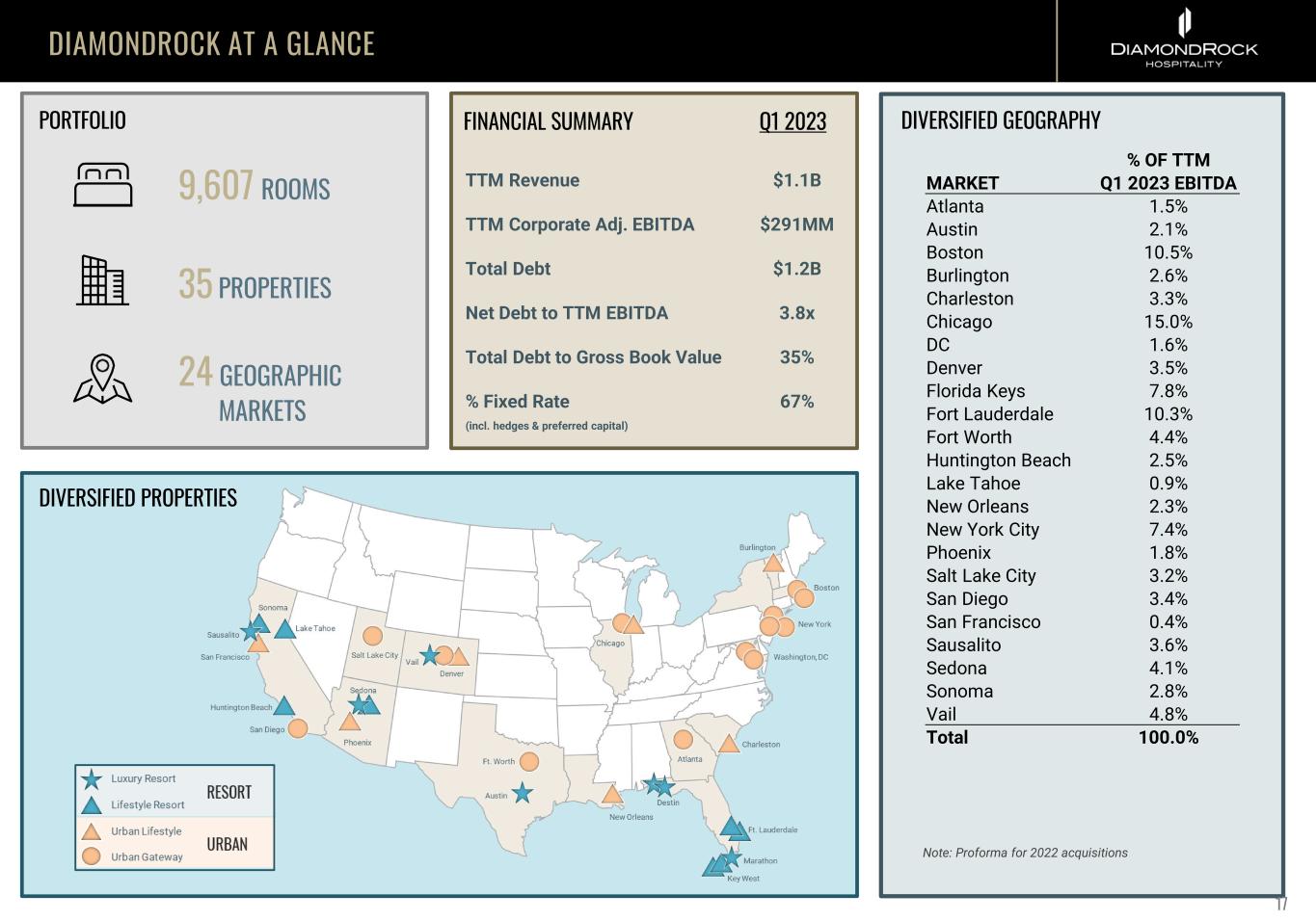 DIAMONDROCK AT A GLANCE 9,607 ROOMS 35 PROPERTIES 24 GEOGRAPHIC MARKETS DIVERSIFIED GEOGRAPHY 17 DIVERSIFIED PROPERTIES FINANCIAL SUMMARY Net Debt to TTM EBITDA Total Debt $1.2B 3.8x Total Debt to Gross Book Value 35% TTM Revenue $1.1B TTM Corporate Adj. EBITDA $291MM Q1 2023PORTFOLIO Note: Proforma for 2022 acquisitions % Fixed Rate (incl. hedges & preferred capital) 67% MARKET % OF TTM Q1 2023 EBITDA Atlanta 1.5% Austin 2.1% Boston 10.5% Burlington 2.6% Charleston 3.3% Chicago 15.0% DC 1.6% Denver 3.5% Florida Keys 7.8% Fort Lauderdale 10.3% Fort Worth 4.4% Huntington Beach 2.5% Lake Tahoe 0.9% New Orleans 2.3% New York City 7.4% Phoenix 1.8% Salt Lake City 3.2% San Diego 3.4% San Francisco 0.4% Sausalito 3.6% Sedona 4.1% Sonoma 2.8% Vail 4.8% Total 100.0%