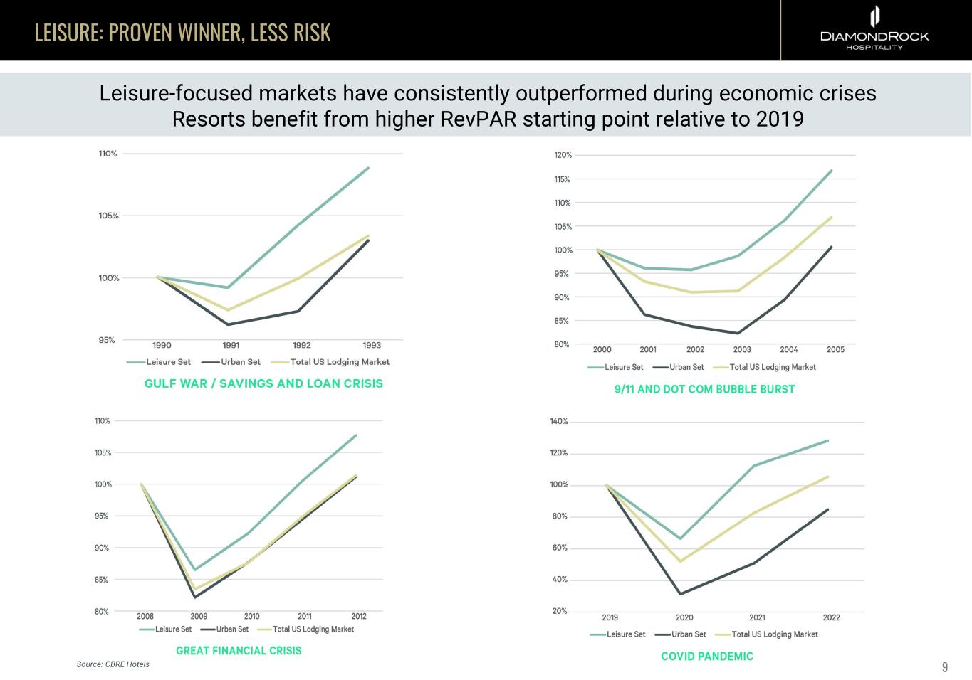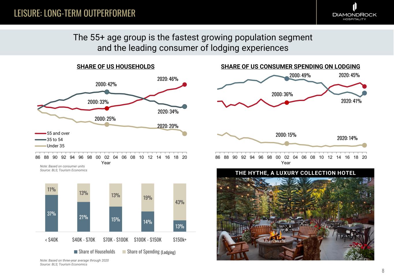 LEISURE: LONG-TERM OUTPERFORMER 8 86 88 90 92 94 96 98 00 02 04 06 08 10 12 14 16 18 20 55 and over 35 to 54 Under 35 Year 2020: 46% 2000: 33% 2020: 34% 2000: 42% 2000: 25% 2020: 20% 86 88 90 92 94 96 98 00 02 04 06 08 10 12 14 16 18 20 Year 2020: 45% 2000: 36% 2020: 41% 2000: 49% 2000: 15% 2020: 14% The 55+ age group is the fastest growing population segment and the leading consumer of lodging experiences SHARE OF US HOUSEHOLDS SHARE OF US CONSUMER SPENDING ON LODGING Note: Based on consumer units Source: BLS; Tourism Economics 37% 21% 15% 14% 13% 11% 13% 13% 19% 43% < $40K $40K - $70K $70K - $100K $100K - $150K $150k+ Share of Households Share of Spending THE HYTHE, A LUXURY COLLECTION HOTEL Note: Based on three-year average through 2020 Source: BLS; Tourism Economics (Lodging)