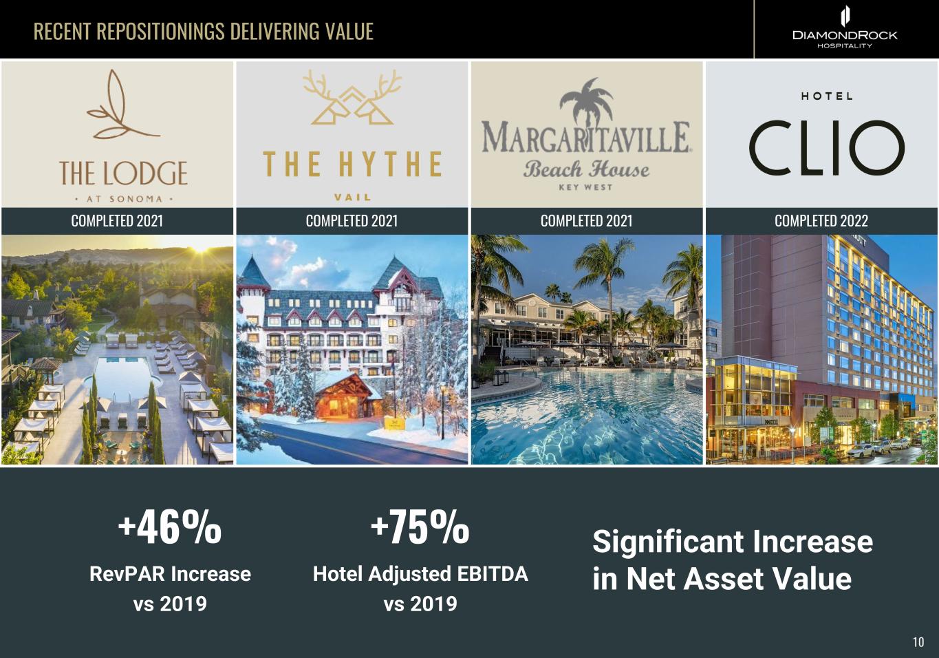 RECENT REPOSITIONINGS DELIVERING VALUE +46% RevPAR Increase vs 2019 COMPLETED 2021 COMPLETED 2021 COMPLETED 2021 COMPLETED 2022 Significant Increase in Net Asset Value +75% Hotel Adjusted EBITDA vs 2019 10