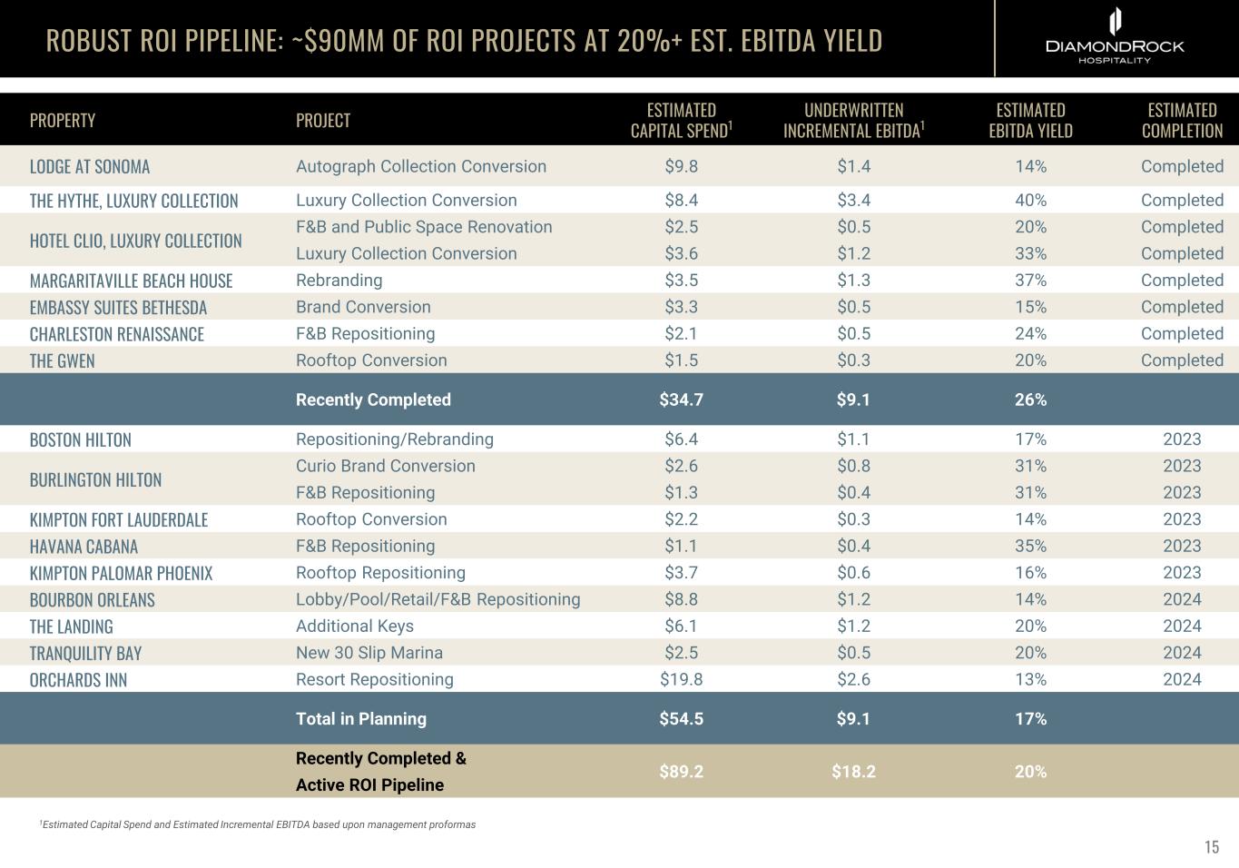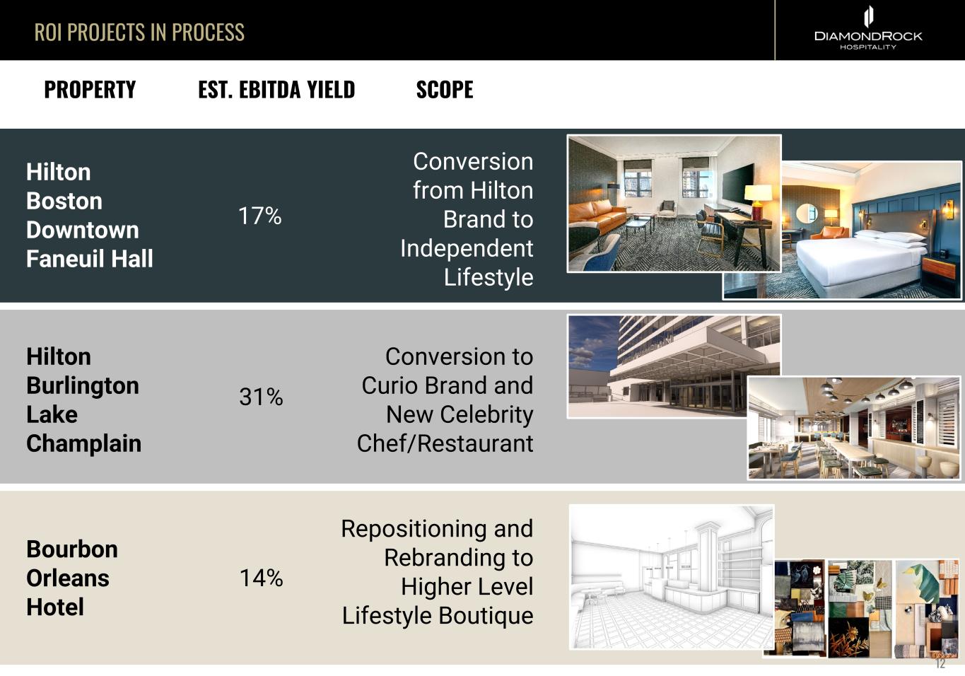 ROI PROJECTS IN PROCESS PROPERTY EST. EBITDA YIELD SCOPE Hilton Boston Downtown Faneuil Hall Hilton Burlington Lake Champlain Bourbon Orleans Hotel 17% 31% Conversion from Hilton Brand to Independent Lifestyle Conversion to Curio Brand and New Celebrity Chef/Restaurant Repositioning and Rebranding to Higher Level Lifestyle Boutique 14% 12