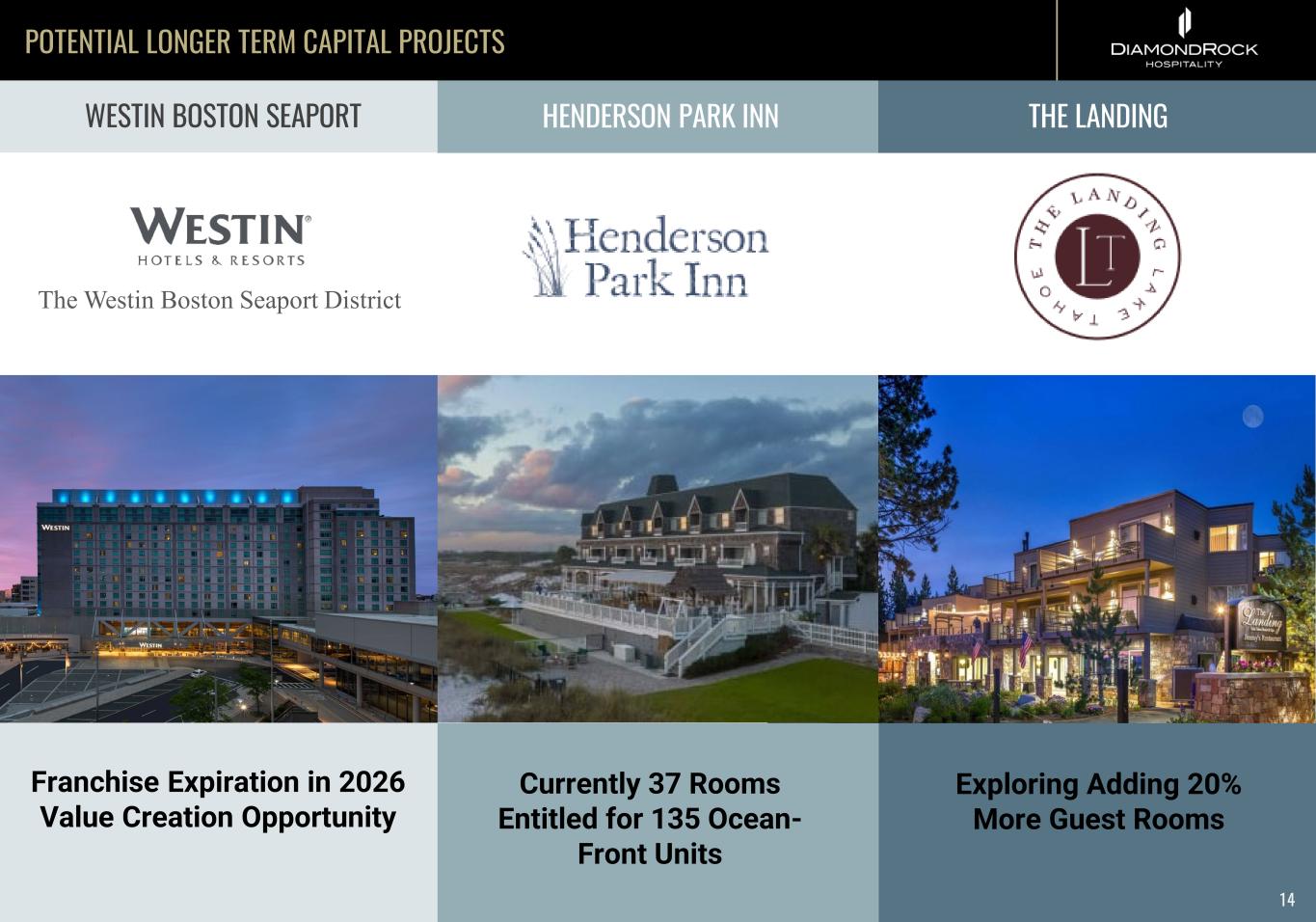 COURTYARD DENVER DOWNTOWNLAKE AUSTIN SPA RESORT ORCHARDS INN 13 POTENTIAL LONGER TERM CAPITAL PROJECTS Repositioning to Integrate with L’Auberge de Sedona Exploring Adding More Waterfront Guest Rooms Courtyard Denver Downtown Franchise Expiration in 2027 Potential Upbranding and Expansion