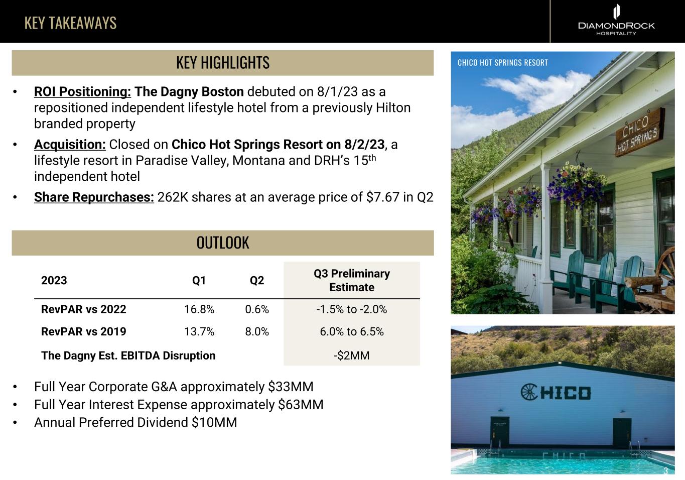 FORWARD LOOKING STATEMENTS & USE OF NON-GAAP FINANCIAL MEASURES FORWARD LOOKING STATEMENTS Certain statements made during this presentation are forward-looking statements that are subject to risks and uncertainties. Forward-looking statements generally include the words “believe,” “expect,” “anticipate,” “plan,” “estimate,” “project,” “will,” “intend” or other similar expressions. Forward-looking statements include, without limitation, statements regarding industry outlook, results of operations, cash flows, business strategies, growth and value opportunities, capital and other expenditures, financing plans, expense reduction initiatives and projected dispositions. Factors that could cause actual results to materially differ from those contained in the forward-looking statements include, without limitation, national and local economic and business conditions, including the impact of COVID-19 on occupancy rates at DiamondRock Hospitality Company’s (the "Company“) hotels and the demand for hotel products and services, and those risks and uncertainties discussed in the most recent Annual Report on Form 10-K, which the Company has filed with the Securities and Exchange Commission, and in our other public filings which you should carefully review. The forward-looking statements made are based on our beliefs, assumptions and expectations of future performance, taking into account all information currently available to the Company. Actual results could differ materially from the forward- looking statements made in this presentation. The forward-looking statements made in this presentation are subject to the safe harbor of the Private Securities Litigation Reform Act of 1995. Any forward-looking statement speaks only as of the date on which it is made. Although the Company believes the expectations reflect ed in such forward-looking statements are based upon reasonable assumptions, it can give no assurance that the expectations will be attained or that any deviation will not be material. All information in this presentation is as of the date of this presentation, and the Company undertakes no obligation to update any forward-looking statement to conform the statement to actual results or changes in the Company’s expectations. This presentation contains statistics and other data that has been obtained or compiled from information made available by third- party service providers and believed to be reliable, but the accuracy and completeness of the information is not assured. The Company has not independently verified any such information. 2 USE OF NON-GAAP FINANCIAL MEASURES We use the following non-GAAP financial measures that we believe are useful to investors as key measures of our operating performance: EBITDA, EBITDAre, Adjusted EBITDA, Hotel EBITDA, Hotel Adjusted EBITDA, FFO and Adjusted FFO. These measures should not be considered in isolation or as a substitute for measures of performance in accordance with U.S. GAAP. EBITDA, EBITDAre, Adjusted EBITDA, Hotel EBITDA, Hotel Adjusted EBITDA, FFO and Adjusted FFO, as calculated by us, may not be comparable to other companies that do not define such terms exactly as the Company. A detailed explanation of these non-GAAP financial measures and the reconciliation of such measures to the most directly comparable financial measures prepared in accordance with U.S. GAAP can be found in the Company’s second quarter 2023 earnings press release dated August 3, 2023.
