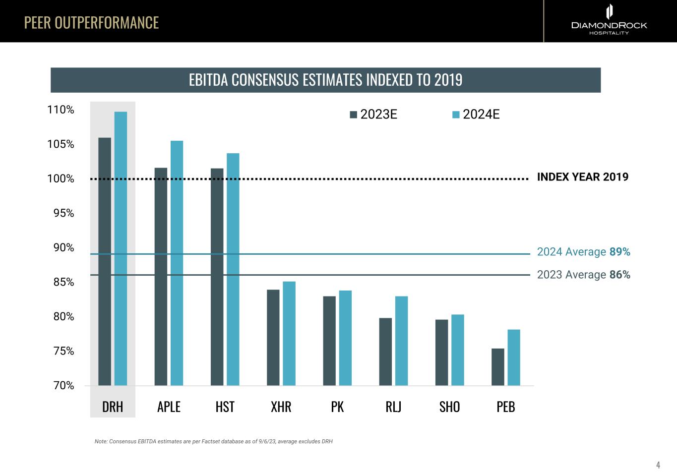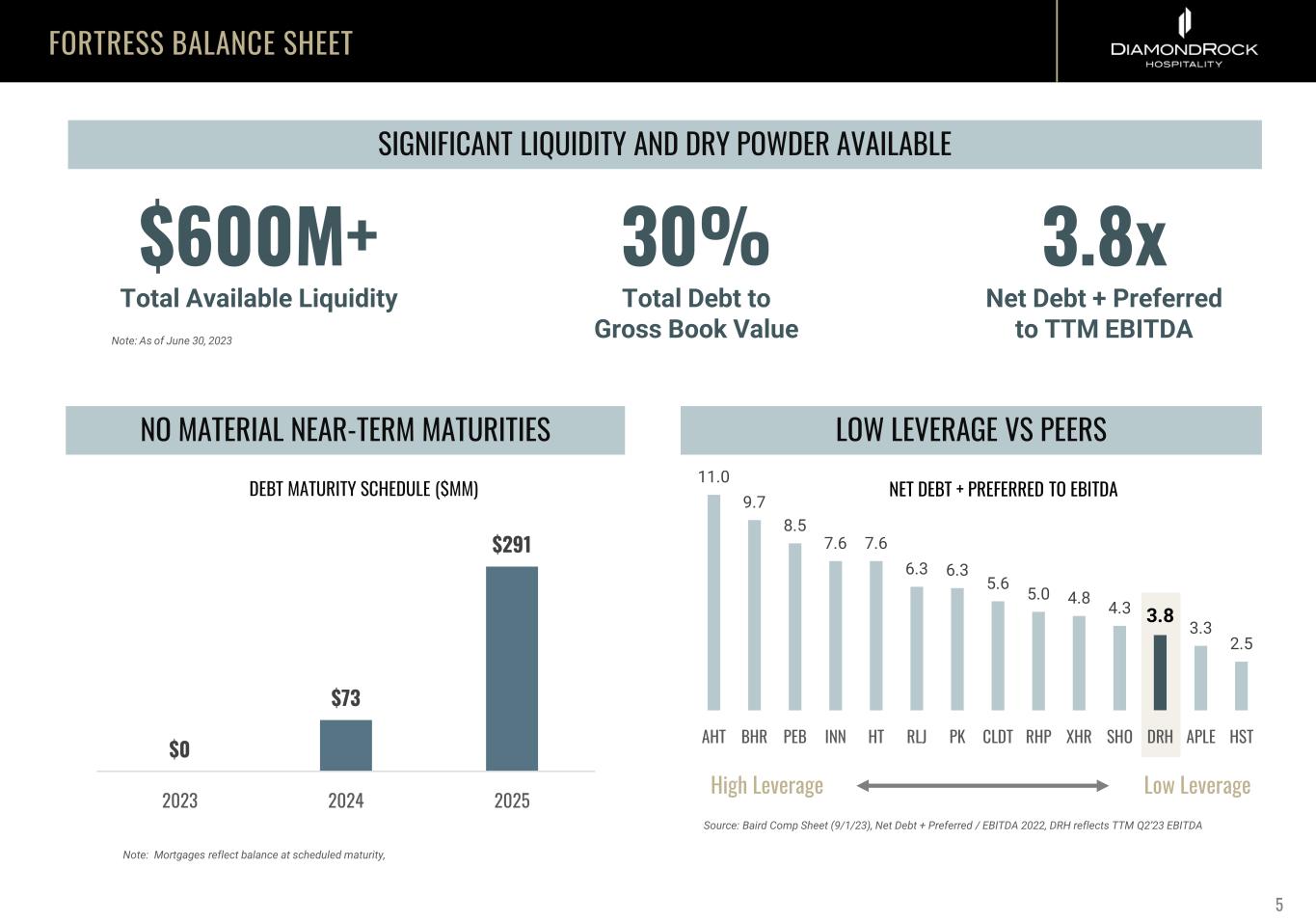 PEER OUTPERFORMANCE 70% 75% 80% 85% 90% 95% 100% 105% 110% DRH APLE HST XHR PK RLJ SHO PEB 2023E 2024E Note: Consensus EBITDA estimates are per Factset database as of 9/6/23, average excludes DRH INDEX YEAR 2019 2023 Average 86% 2024 Average 89% EBITDA CONSENSUS ESTIMATES INDEXED TO 2019 4