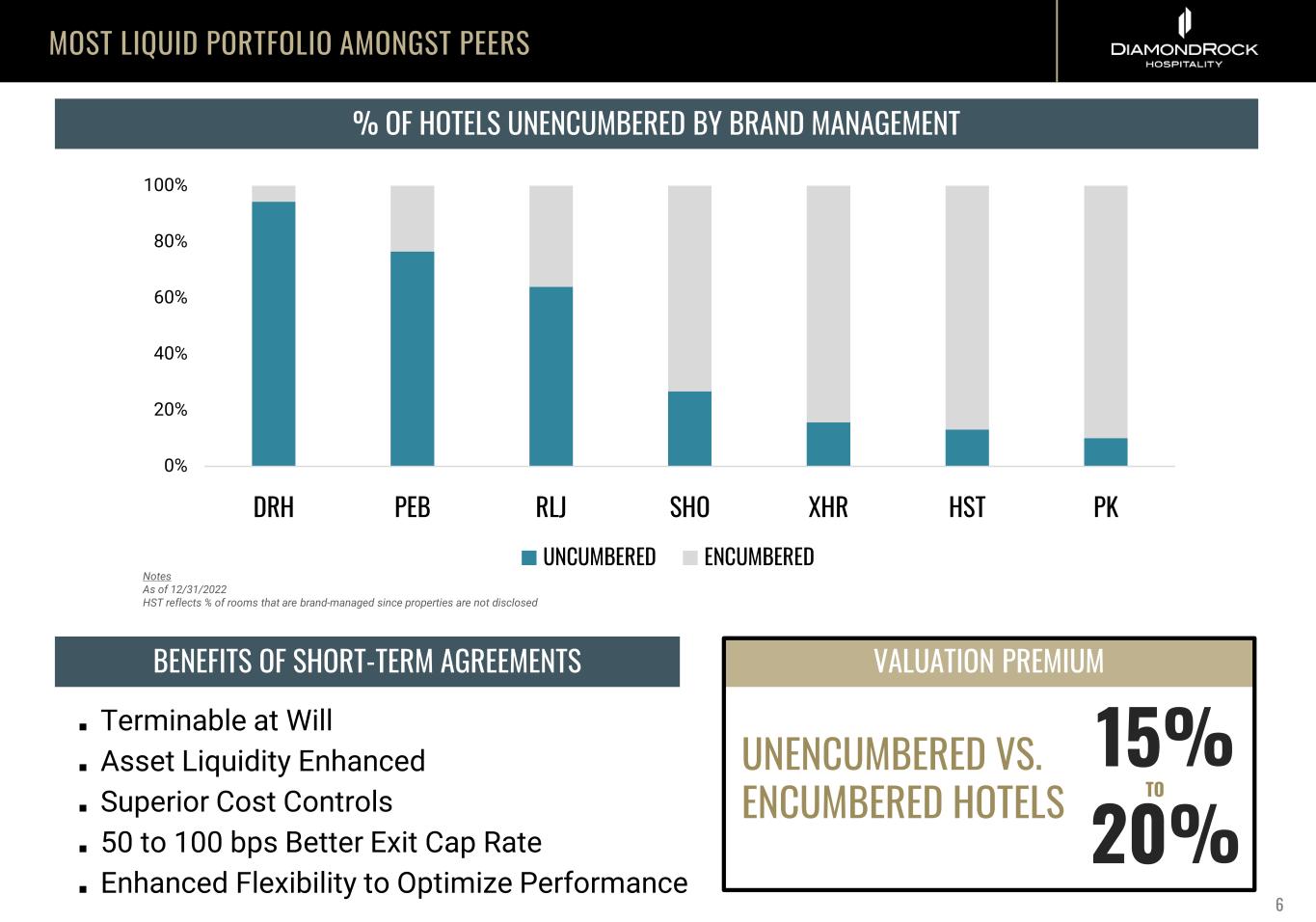 NO MATERIAL NEAR-TERM MATURITIES FORTRESS BALANCE SHEET Note: Mortgages reflect balance at scheduled maturity, $600M+ Total Available Liquidity 30% Total Debt to Gross Book Value 3.8x Net Debt + Preferred to TTM EBITDANote: As of June 30, 2023 DEBT MATURITY SCHEDULE ($MM) SIGNIFICANT LIQUIDITY AND DRY POWDER AVAILABLE 5 $0 $73 $291 2023 2024 2025 LOW LEVERAGE VS PEERS Low Leverage 11.0 9.7 8.5 7.6 7.6 6.3 6.3 5.6 5.0 4.8 4.3 3.8 3.3 2.5 AHT BHR PEB INN HT RLJ PK CLDT RHP XHR SHO DRH APLE HST Source: Baird Comp Sheet (9/1/23), Net Debt + Preferred / EBITDA 2022, DRH reflects TTM Q2’23 EBITDA High Leverage NET DEBT + PREFERRED TO EBITDA