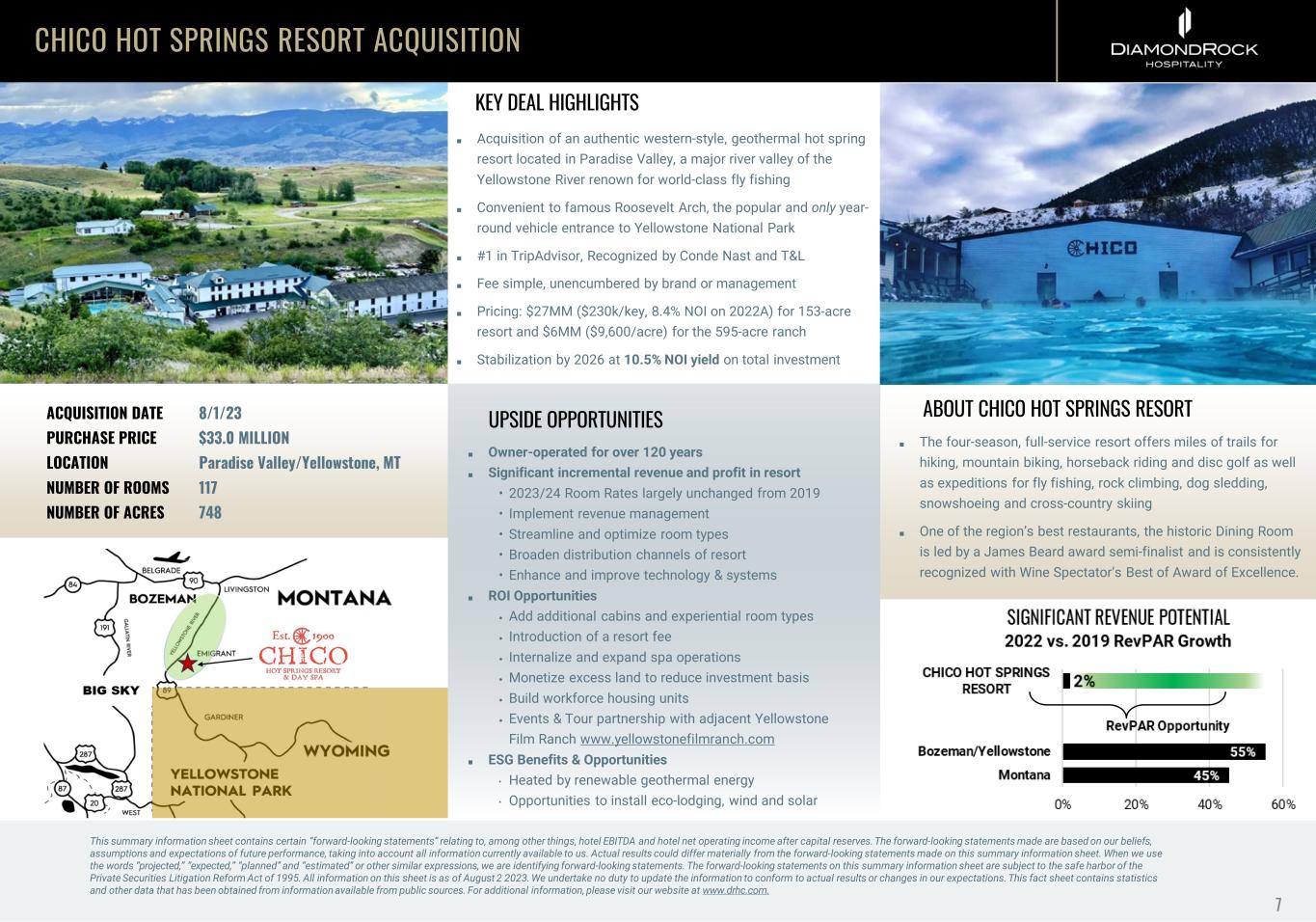 CHICO HOT SPRINGS RESORT ACQUISITION ACQUISITION DATE 8/1/23 PURCHASE PRICE $33.0 MILLION LOCATION Paradise Valley/Yellowstone, MT NUMBER OF ROOMS 117 NUMBER OF ACRES 748 KEY DEAL HIGHLIGHTS ■ Acquisition of an authentic western-style, geothermal hot spring resort located in Paradise Valley, a major river valley of the Yellowstone River renown for world-class fly fishing ■ Convenient to famous Roosevelt Arch, the popular and only year- round vehicle entrance to Yellowstone National Park ■ #1 in TripAdvisor, Recognized by Conde Nast and T&L ■ Fee simple, unencumbered by brand or management ■ Pricing: $27MM ($230k/key, 8.4% NOI on 2022A) for 153-acre resort and $6MM ($9,600/acre) for the 595-acre ranch ■ Stabilization by 2026 at 10.5% NOI yield on total investment UPSIDE OPPORTUNITIES ■ Owner-operated for over 120 years ■ Significant incremental revenue and profit in resort • 2023/24 Room Rates largely unchanged from 2019 • Implement revenue management • Streamline and optimize room types • Broaden distribution channels of resort • Enhance and improve technology & systems ■ ROI Opportunities • Add additional cabins and experiential room types • Introduction of a resort fee • Internalize and expand spa operations • Monetize excess land to reduce investment basis • Build workforce housing units • Events & Tour partnership with adjacent Yellowstone Film Ranch www.yellowstonefilmranch.com ■ ESG Benefits & Opportunities • Heated by renewable geothermal energy • Opportunities to install eco-lodging, wind and solar ABOUT CHICO HOT SPRINGS RESORT This summary information sheet contains certain “forward-looking statements” relating to, among other things, hotel EBITDA and hotel net operating income after capital reserves. The forward-looking statements made are based on our beliefs, assumptions and expectations of future performance, taking into account all information currently available to us. Actual results could differ materially from the forward-looking statements made on this summary information sheet. When we use the words “projected,” “expected,” “planned” and “estimated” or other similar expressions, we are identifying forward-looking statements. The forward-looking statements on this summary information sheet are subject to the safe harbor of the Private Securities Litigation Reform Act of 1995. All information on this sheet is as of August 2 2023. We undertake no duty to update the information to conform to actual results or changes in our expectations. This fact sheet contains statistics and other data that has been obtained from information available from public sources. For additional information, please visit our website at www.drhc.com. ■ The four-season, full-service resort offers miles of trails for hiking, mountain biking, horseback riding and disc golf as well as expeditions for fly fishing, rock climbing, dog sledding, snowshoeing and cross-country skiing ■ One of the region’s best restaurants, the historic Dining Room is led by a James Beard award semi-finalist and is consistently recognized with Wine Spectator’s Best of Award of Excellence. 7