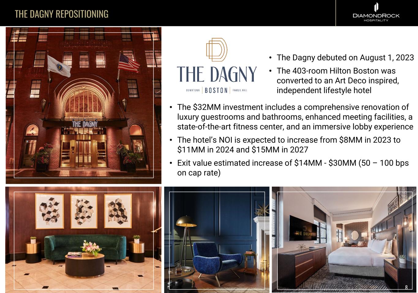 THE DAGNY REPOSITIONING • The Dagny debuted on August 1, 2023 • The 403-room Hilton Boston was converted to an Art Deco inspired, independent lifestyle hotel • The $32MM investment includes a comprehensive renovation of luxury guestrooms and bathrooms, enhanced meeting facilities, a state-of-the-art fitness center, and an immersive lobby experience • The hotel’s NOI is expected to increase from $8MM in 2023 to $11MM in 2024 and $15MM in 2027 • Exit value estimated increase of $14MM - $30MM (50 – 100 bps on cap rate) 8