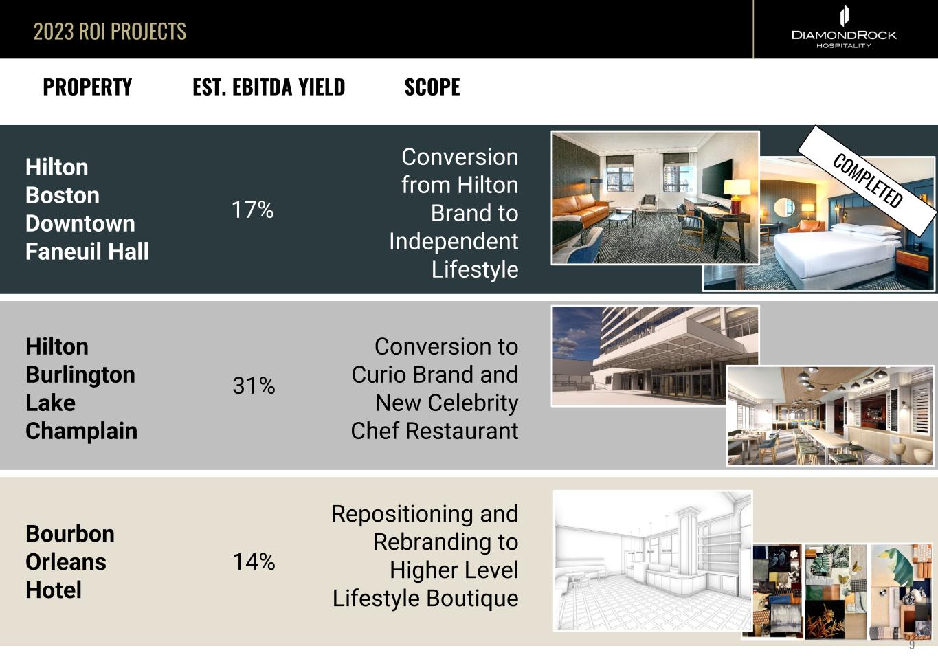 2023 ROI PROJECTS PROPERTY EST. EBITDA YIELD SCOPE Hilton Boston Downtown Faneuil Hall Hilton Burlington Lake Champlain Bourbon Orleans Hotel 17% 31% Conversion from Hilton Brand to Independent Lifestyle Conversion to Curio Brand and New Celebrity Chef Restaurant Repositioning and Rebranding to Higher Level Lifestyle Boutique 14% 9
