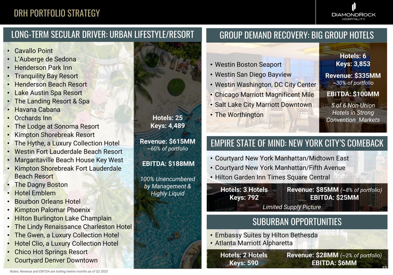 DRH PORTFOLIO STRATEGY • Westin Boston Seaport • Westin San Diego Bayview • Westin Washington, DC City Center • Chicago Marriott Magnificent Mile • Salt Lake City Marriott Downtown • The Worthington LONG-TERM SECULAR DRIVER: URBAN LIFESTYLE/RESORT GROUP DEMAND RECOVERY: BIG GROUP HOTELS EMPIRE STATE OF MIND: NEW YORK CITY’S COMEBACK Hotels: 25 Keys: 4,489 Revenue: $615MM ~60% of portfolio EBITDA: $188MM 100% Unencumbered by Management & Highly Liquid Hotels: 6 Keys: 3,853 Revenue: $335MM ~30% of portfolio EBITDA: $100MM 5 of 6 Non-Union Hotels in Strong Convention Markets • Courtyard New York Manhattan/Midtown East • Courtyard New York Manhattan/Fifth Avenue • Hilton Garden Inn Times Square Central SUBURBAN OPPORTUNITIES • Embassy Suites by Hilton Bethesda • Atlanta Marriott Alpharetta • Cavallo Point • L’Auberge de Sedona • Henderson Park Inn • Tranquility Bay Resort • Henderson Beach Resort • Lake Austin Spa Resort • The Landing Resort & Spa • Havana Cabana • Orchards Inn • The Lodge at Sonoma Resort • Kimpton Shorebreak Resort • The Hythe, a Luxury Collection Hotel • Westin Fort Lauderdale Beach Resort • Margaritaville Beach House Key West • Kimpton Shorebreak Fort Lauderdale Beach Resort • The Dagny Boston • Hotel Emblem • Bourbon Orleans Hotel • Kimpton Palomar Phoenix • Hilton Burlington Lake Champlain • The Lindy Renaissance Charleston Hotel • The Gwen, a Luxury Collection Hotel • Hotel Clio, a Luxury Collection Hotel • Chico Hot Springs Resort • Courtyard Denver Downtown Notes: Revenue and EBITDA are trailing twelve months as of Q2 2023 Hotels: 3 Hotels Keys: 792 Revenue: $85MM (~8% of portfolio) EBITDA: $25MM Limited Supply Picture Hotels: 2 Hotels Keys: 590 Revenue: $28MM (~2% of portfolio) EBITDA: $6MM 12