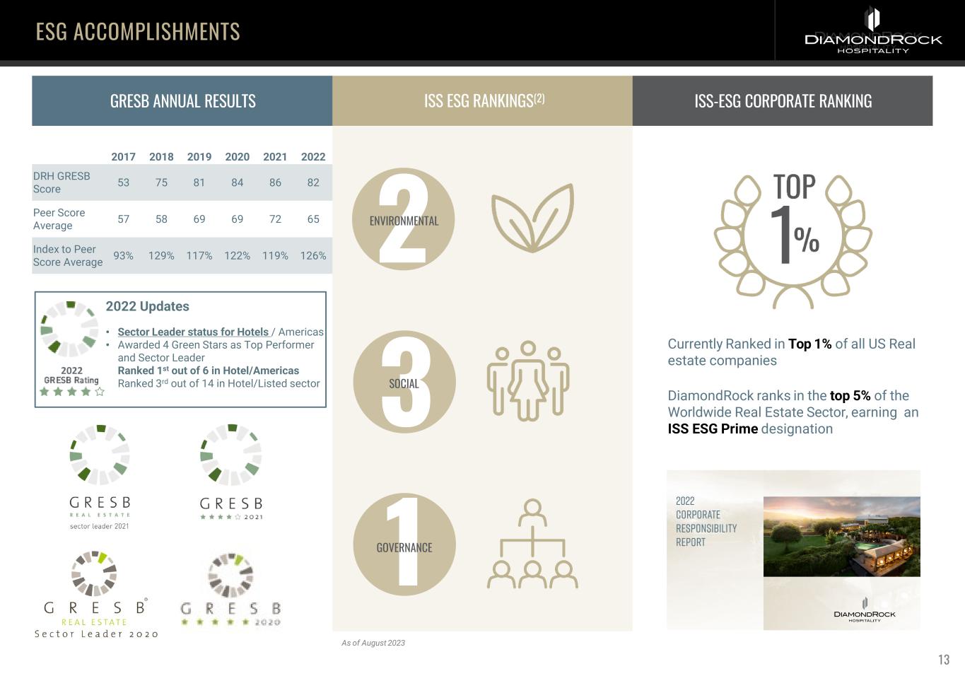 ISS ESG RANKINGS(2) ISS-ESG CORPORATE RANKING Currently Ranked in Top 1% of all US Real estate companies DiamondRock ranks in the top 5% of the Worldwide Real Estate Sector, earning an ISS ESG Prime designation 2ENVIRONMENTAL 3SOCIAL 1GOVERNANCE GRESB ANNUAL RESULTS 2017 2018 2019 2020 2021 2022 DRH GRESB Score 53 75 81 84 86 82 Peer Score Average 57 58 69 69 72 65 Index to Peer Score Average 93% 129% 117% 122% 119% 126% ESG ACCOMPLISHMENTS As of August 2023 2022 Updates • Sector Leader status for Hotels / Americas • Awarded 4 Green Stars as Top Performer and Sector Leader • Ranked 1st out of 6 in Hotel/Americas • Ranked 3rd out of 14 in Hotel/Listed sector 2022 13
