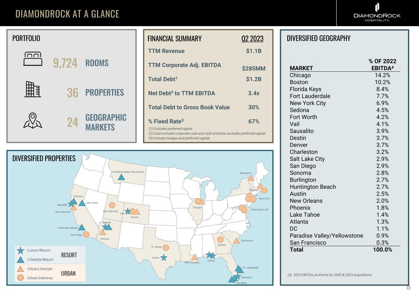 DIAMONDROCK AT A GLANCE DIVERSIFIED GEOGRAPHY 15 DIVERSIFIED PROPERTIES FINANCIAL SUMMARY Net Debt2 to TTM EBITDA Total Debt1 $1.2B 3.4x Total Debt to Gross Book Value 30% TTM Revenue $1.1B TTM Corporate Adj. EBITDA $285MM Q2 2023PORTFOLIO % Fixed Rate3 67% 9,724 36 24 ROOMS GEOGRAPHIC MARKETS PROPERTIES (4) 2022 EBITDA, proforma for 2022 & 2023 acquisitions (1) Excludes preferred capital (2) Cash includes corporate cash and cash at hotels, excludes preferred capital (3) Includes hedges and preferred capital MARKET % OF 2022 EBITDA4 Chicago 14.2% Boston 10.2% Florida Keys 8.4% Fort Lauderdale 7.7% New York City 6.9% Sedona 4.5% Fort Worth 4.2% Vail 4.1% Sausalito 3.9% Destin 3.7% Denver 3.7% Charleston 3.2% Salt Lake City 2.9% San Diego 2.9% Sonoma 2.8% Burlington 2.7% Huntington Beach 2.7% Austin 2.5% New Orleans 2.0% Phoenix 1.8% Lake Tahoe 1.4% Atlanta 1.3% DC 1.1% Paradise Valley/Yellowstone 0.9% San Francisco 0.3% Total 100.0%
