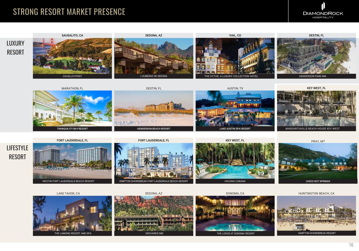 STRONG RESORT MARKET PRESENCE SAUSALITO, CA FORT LAUDERDALE, FL MARATHON, FL SEDONA, AZ DESTIN, FL CAVALLO POINT TRANQUILITY BAY RESORT VAIL, CO DESTIN, FL THE HYTHE, A LUXURY COLLECTION HOTEL HENDERSON PARK INN SEDONA, AZ SONOMA, CALAKE TAHOE, CA LUXURY RESORT LIFESTYLE RESORT THE LODGE AT SONOMA RESORT 16 L’AUBERGE DE SEDONA ORCHARDS INNTHE LANDING RESORT AND SPA KIMPTON SHOREBREAK RESORT HUNTINGTON BEACH, CA AUSTIN, TX WESTIN FORT LAUDERDALE BEACH RESORT HAVANA CABANA HENDERSON BEACH RESORT LAKE AUSTIN SPA RESORT FORT LAUDERDALE, FL KEY WEST, FL KIMPTON SHOREBREAK FORT LAUDERDALE BEACH RESORT CHICO HOT SPRINGS PRAY, MT MARGARITAVILLE BEACH HOUSE KEY WEST KEY WEST, FL