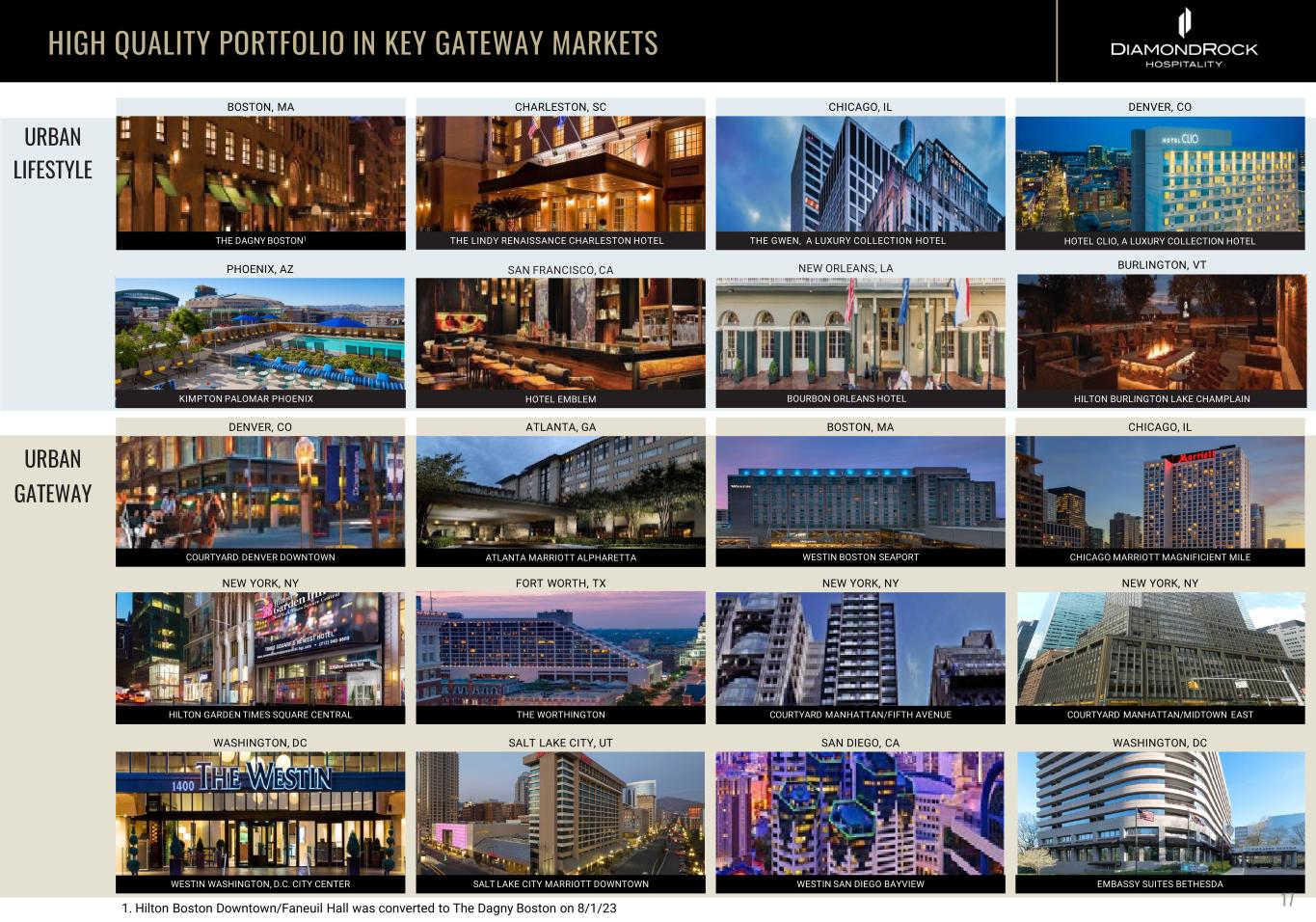 HIGH QUALITY PORTFOLIO IN KEY GATEWAY MARKETS DENVER, CO SAN DIEGO, CA COURTYARD DENVER DOWNTOWN WESTIN WASHINGTON, D.C. CITY CENTER WESTIN SAN DIEGO BAYVIEW URBAN GATEWAY SALT LAKE CITY, UT SALT LAKE CITY MARRIOTT DOWNTOWN URBAN LIFESTYLE BOURBON ORLEANS HOTELHOTEL EMBLEM HILTON BURLINGTON LAKE CHAMPLAINKIMPTON PALOMAR PHOENIX NEW YORK, NY HILTON GARDEN TIMES SQUARE CENTRAL WASHINGTON, DC EMBASSY SUITES BETHESDA WASHINGTON, DC THE LINDY RENAISSANCE CHARLESTON HOTEL THE GWEN, A LUXURY COLLECTION HOTEL HOTEL CLIO, A LUXURY COLLECTION HOTEL COURTYARD MANHATTAN/FIFTH AVENUE COURTYARD MANHATTAN/MIDTOWN EAST FORT WORTH, TX NEW YORK, NYNEW YORK, NY BOSTON, MA THE DAGNY BOSTON1 CHICAGO, IL BURLINGTON, VT CHARLESTON, SC DENVER, COCHICAGO, IL PHOENIX, AZ SAN FRANCISCO, CA NEW ORLEANS, LA ATLANTA MARRIOTT ALPHARETTA ATLANTA, GA 1. Hilton Boston Downtown/Faneuil Hall was converted to The Dagny Boston on 8/1/23 CHICAGO MARRIOTT MAGNIFICIENT MILEWESTIN BOSTON SEAPORT BOSTON, MA THE WORTHINGTON 17