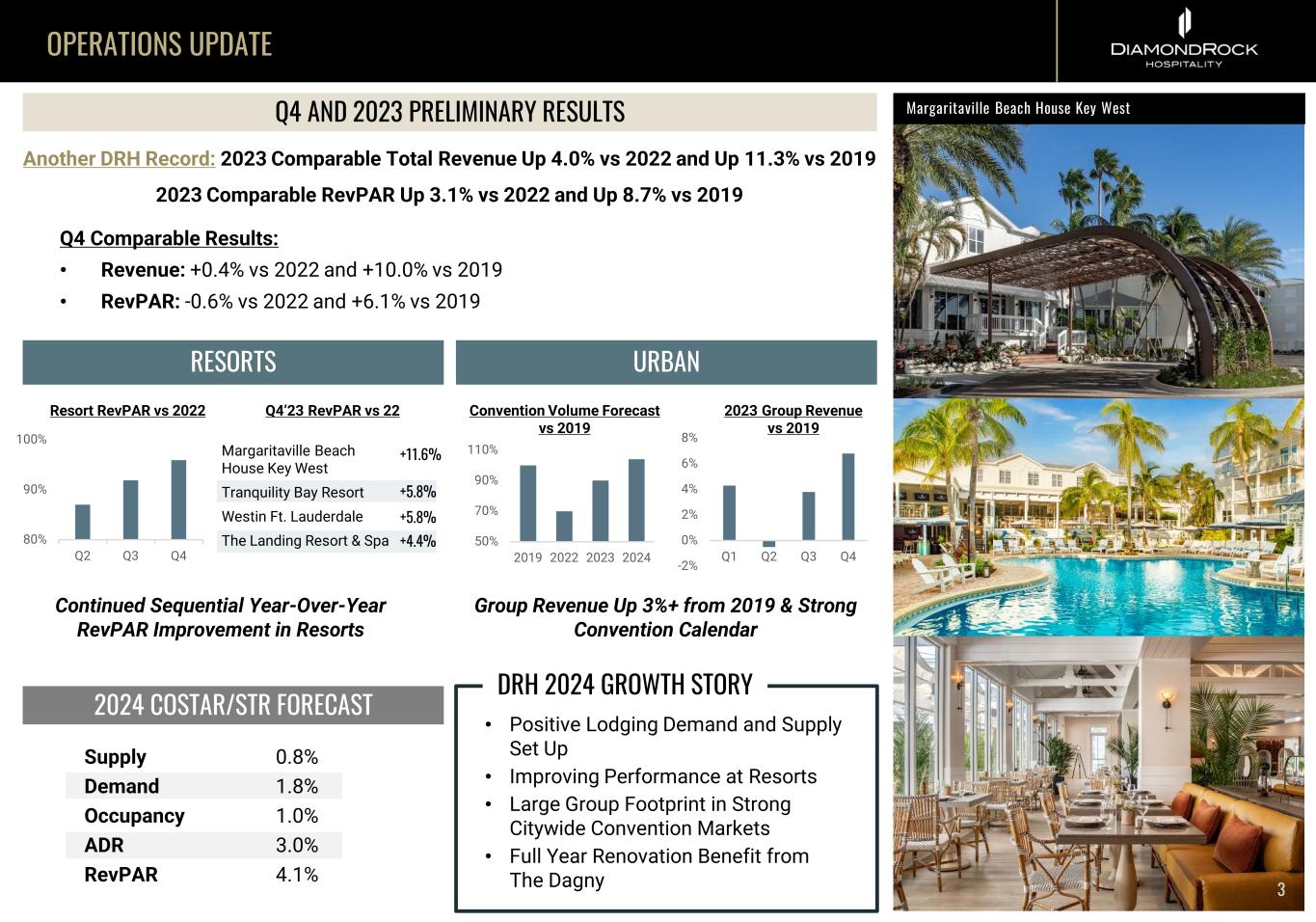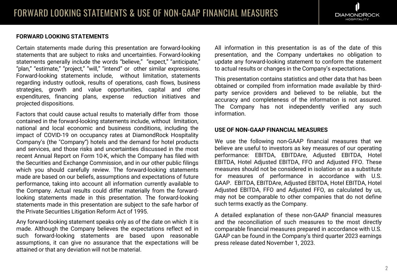FORWARD LOOKING STATEMENTS & USE OF NON-GAAP FINANCIAL MEASURES FORWARD LOOKING STATEMENTS Certain statements made during this presentation are forward-looking statements that are subject to risks and uncertainties. Forward-looking statements generally include the words “believe,” “expect,” “anticipate,” “plan,” “estimate,” “project,” “will,” “intend” or other similar expressions. Forward-looking statements include, without limitation, statements regarding industry outlook, results of operations, cash flows, business strategies, growth and value opportunities, capital and other expenditures, financing plans, expense reduction initiatives and projected dispositions. Factors that could cause actual results to materially differ from those contained in the forward-looking statements include, without limitation, national and local economic and business conditions, including the impact of COVID-19 on occupancy rates at DiamondRock Hospitality Company’s (the "Company“) hotels and the demand for hotel products and services, and those risks and uncertainties discussed in the most recent Annual Report on Form 10-K, which the Company has filed with the Securities and Exchange Commission, and in our other public filings which you should carefully review. The forward-looking statements made are based on our beliefs, assumptions and expectations of future performance, taking into account all information currently available to the Company. Actual results could differ materially from the forward- looking statements made in this presentation. The forward-looking statements made in this presentation are subject to the safe harbor of the Private Securities Litigation Reform Act of 1995. Any forward-looking statement speaks only as of the date on which it is made. Although the Company believes the expectations reflect ed in such forward-looking statements are based upon reasonable assumptions, it can give no assurance that the expectations will be attained or that any deviation will not be material. All information in this presentation is as of the date of this presentation, and the Company undertakes no obligation to update any forward-looking statement to conform the statement to actual results or changes in the Company’s expectations. This presentation contains statistics and other data that has been obtained or compiled from information made available by third- party service providers and believed to be reliable, but the accuracy and completeness of the information is not assured. The Company has not independently verified any such information. USE OF NON-GAAP FINANCIAL MEASURES We use the following non-GAAP financial measures that we believe are useful to investors as key measures of our operating performance: EBITDA, EBITDAre, Adjusted EBITDA, Hotel EBITDA, Hotel Adjusted EBITDA, FFO and Adjusted FFO. These measures should not be considered in isolation or as a substitute for measures of performance in accordance with U.S. GAAP. EBITDA, EBITDAre, Adjusted EBITDA, Hotel EBITDA, Hotel Adjusted EBITDA, FFO and Adjusted FFO, as calculated by us, may not be comparable to other companies that do not define such terms exactly as the Company. A detailed explanation of these non-GAAP financial measures and the reconciliation of such measures to the most directly comparable financial measures prepared in accordance with U.S. GAAP can be found in the Company’s third quarter 2023 earnings press release dated November 1, 2023. 2