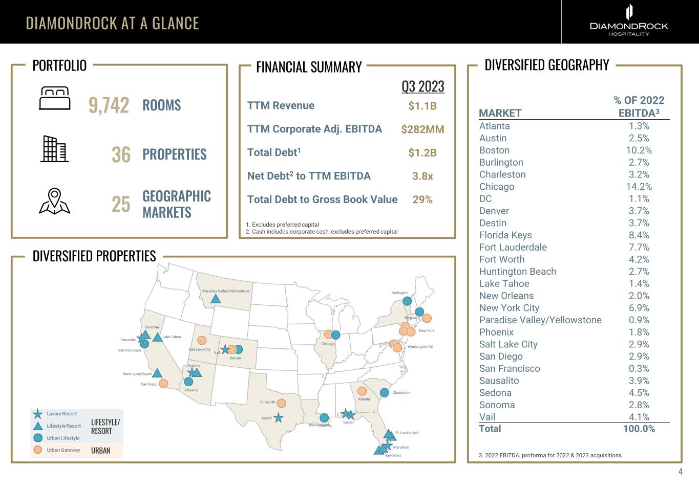 DIAMONDROCK AT A GLANCE DIVERSIFIED GEOGRAPHY DIVERSIFIED PROPERTIES FINANCIAL SUMMARY Net Debt2 to TTM EBITDA Total Debt1 $1.2B 3.8x Total Debt to Gross Book Value 29% TTM Revenue $1.1B TTM Corporate Adj. EBITDA $282MM Q3 2023 PORTFOLIO 9,742 36 25 ROOMS GEOGRAPHIC MARKETS PROPERTIES 3. 2022 EBITDA, proforma for 2022 & 2023 acquisitions 1. Excludes preferred capital 2. Cash includes corporate cash, excludes preferred capital MARKET % OF 2022 EBITDA3 Atlanta 1.3% Austin 2.5% Boston 10.2% Burlington 2.7% Charleston 3.2% Chicago 14.2% DC 1.1% Denver 3.7% Destin 3.7% Florida Keys 8.4% Fort Lauderdale 7.7% Fort Worth 4.2% Huntington Beach 2.7% Lake Tahoe 1.4% New Orleans 2.0% New York City 6.9% Paradise Valley/Yellowstone 0.9% Phoenix 1.8% Salt Lake City 2.9% San Diego 2.9% San Francisco 0.3% Sausalito 3.9% Sedona 4.5% Sonoma 2.8% Vail 4.1% Total 100.0% 4