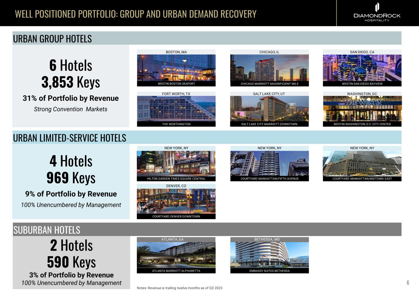 24 Hotels 4,330 Keys 57% of Portfolio by Revenue 15 Independent Hotels 100% Unencumbered by Management WELL POSITIONED PORTFOLIO: LEISURE AS A LONG-TERM SECULAR DRIVER LUXURY & LIFESTYLE RESORTS URBAN LIFESTYLE HOTELS SAUSALITO, CA L’AUBERGE DE SEDONA THE LANDING RESORT AND SPA SEDONA, AZ SONOMA, CA HAVANA CABANA KIMPTON SHOREBREAK RESORT BURLINGTON, VT CHARLESTON, SC THE LINDY CHARLESTON HISTORIC DISTRICT CHICAGO, IL THE GWEN, A LUXURY COLLECTION HOTEL SAN FRANCISCO, CAPHOENIX, AZ NEW ORLEANS, LA HOTEL CLIO, A LUXURY COLLECTION HOTELHOTEL CHAMPLAIN BURLINGTON BOSTON, MA DENVER, CO HENDERSON BEACH RESORT LAKE AUSTIN SPA RESORT WESTIN FORT LAUDERDALE BEACH RESORT MARGARITAVILLE BEACH HOUSE KEY WEST TRANQUILITY BAY RESORT MARATHON, FLAUSTIN, TX FORT LAUDERDALE, FL KEY WEST, FL DESTIN, FLSEDONA, AZ LAKE TAHOE, CA HUNTINGTON BEACH, CA VAIL, CO DESTIN, FL FORT LAUDERDALE, FL KEY WEST, FL THE HYTHE, A LUXURY COLLECTION HOTEL HENDERSON PARK INN KIMPTON SHOREBREAK FORT LAUDERDALE BEACH RESORT CAVALLO POINT ORCHARDS INN THE LODGE AT SONOMA RESORT Notes: Revenue is trailing twelve months as of Q3 2023 PRAY, MT CHICO HOT SPRINGS HOTEL PALOMAR PHOENIX BOURBON ORLEANS HOTELHOTEL EMBLEM THE DAGNY BOSTON 5
