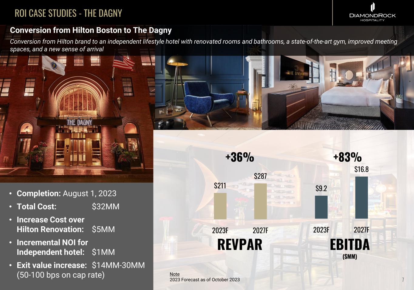 COURTYARD MANHATTAN/FIFTH AVENUE COURTYARD MANHATTAN/MIDTOWN EASTHILTON GARDEN TIMES SQUARE CENTRAL 4 Hotels 969 Keys 9% of Portfolio by Revenue 100% Unencumbered by Management WELL POSITIONED PORTFOLIO: GROUP AND URBAN DEMAND RECOVERY 6 Hotels 3,853 Keys 31% of Portfolio by Revenue Strong Convention Markets 2 Hotels 590 Keys 3% of Portfolio by Revenue 100% Unencumbered by Management THE WORTHINGTON SALT LAKE CITY MARRIOTT DOWNTOWN EMBASSY SUITES BETHESDAATLANTA MARRIOTT ALPHARETTA WESTIN WASHINGTON, D.C. CITY CENTER URBAN GROUP HOTELS URBAN LIMITED-SERVICE HOTELS SUBURBAN HOTELS CHICAGO, ILBOSTON, MA BETHESDA, MDATLANTA, GA NEW YORK, NYNEW YORK, NYNEW YORK, NY Notes: Revenue is trailing twelve months as of Q3 2023 6 DENVER, CO COURTYARD DENVER DOWNTOWN SAN DIEGO, CA FORT WORTH, TX SALT LAKE CITY, UT WASHINGTON, DC CHICAGO MARRIOTT MAGNIFICIENT MILEWESTIN BOSTON SEAPORT WESTIN SAN DIEGO BAYVIEW