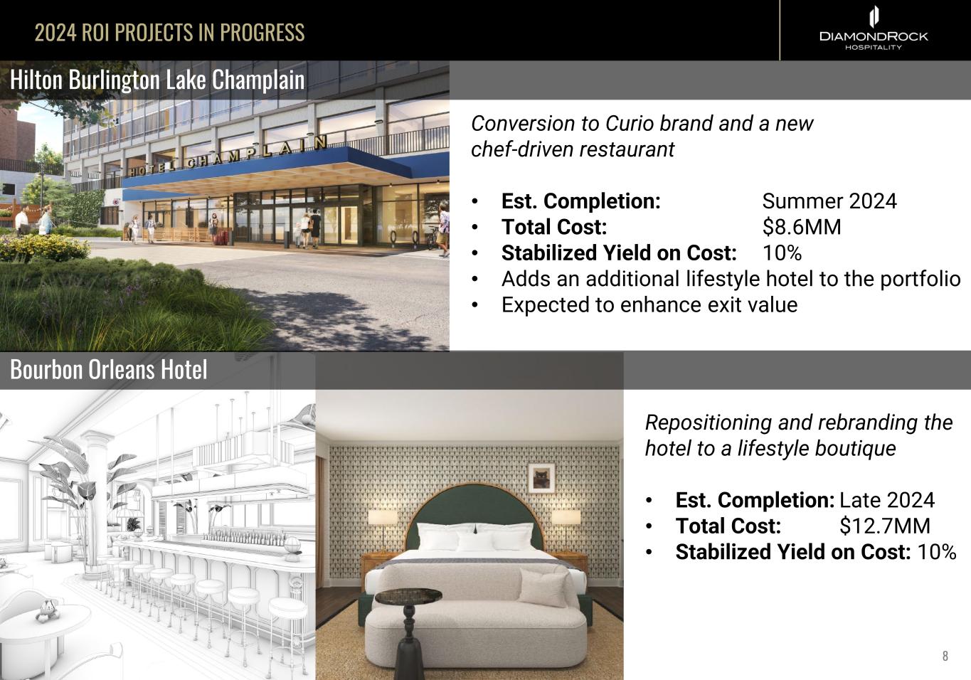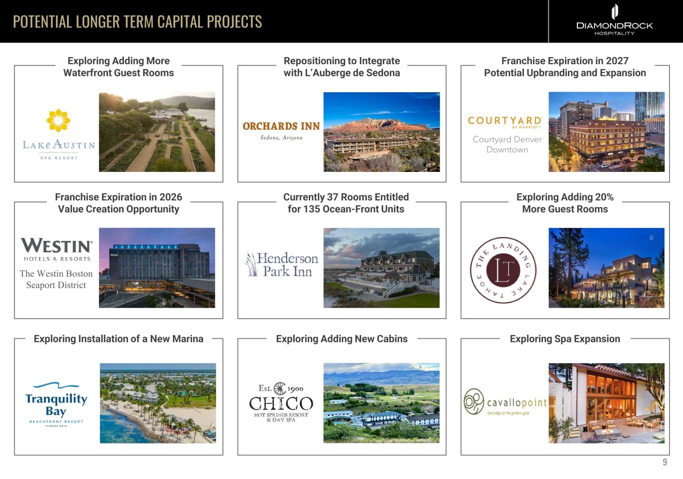 2024 ROI PROJECTS IN PROGRESS Conversion to Curio brand and a new chef-driven restaurant • Est. Completion: Summer 2024 • Total Cost: $8.6MM • Stabilized Yield on Cost: 10% • Adds an additional lifestyle hotel to the portfolio • Expected to enhance exit value Repositioning and rebranding the hotel to a lifestyle boutique • Est. Completion: Late 2024 • Total Cost: $12.7MM • Stabilized Yield on Cost: 10% Hilton Burlington Lake Champlain Bourbon Orleans Hotel 8