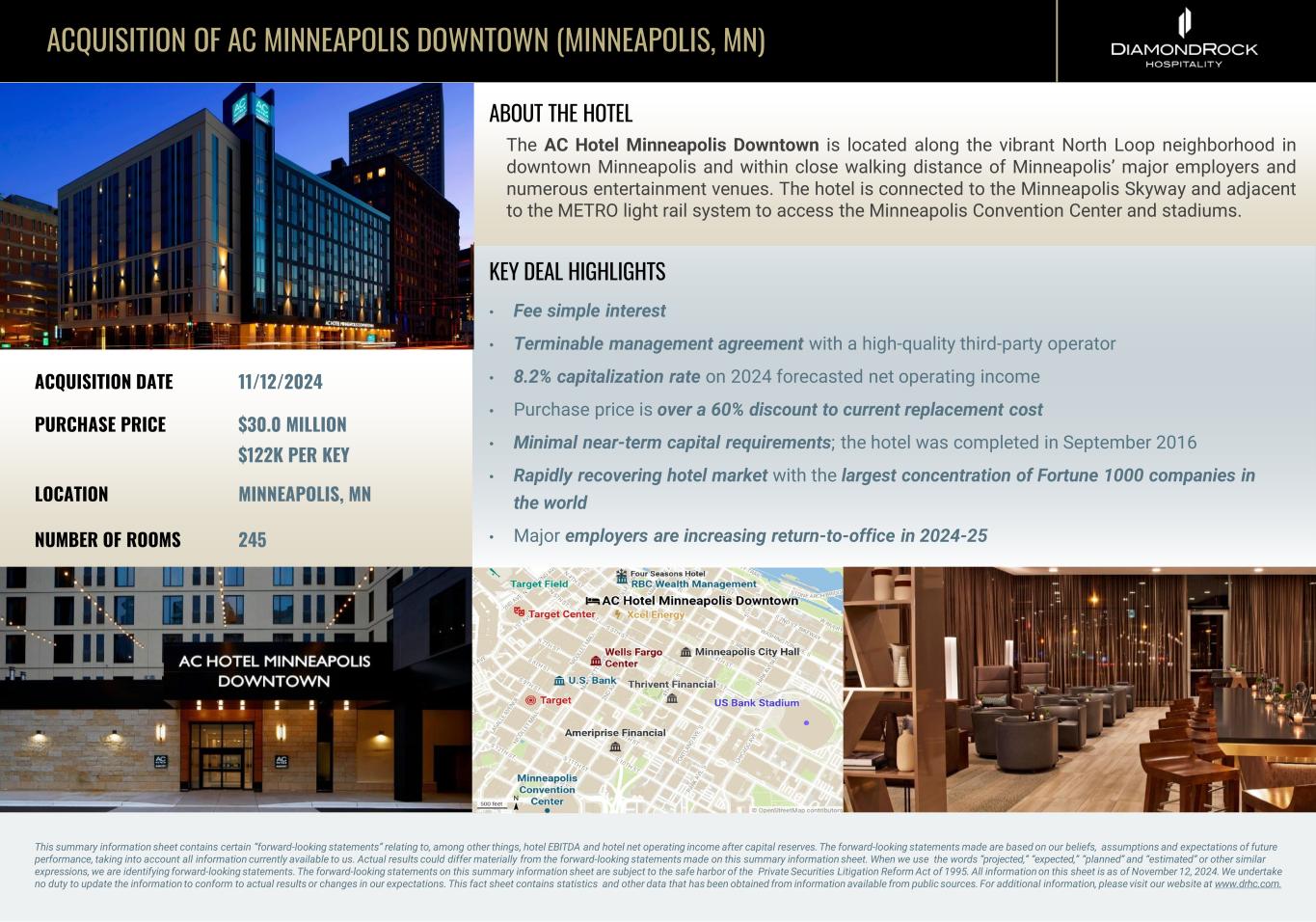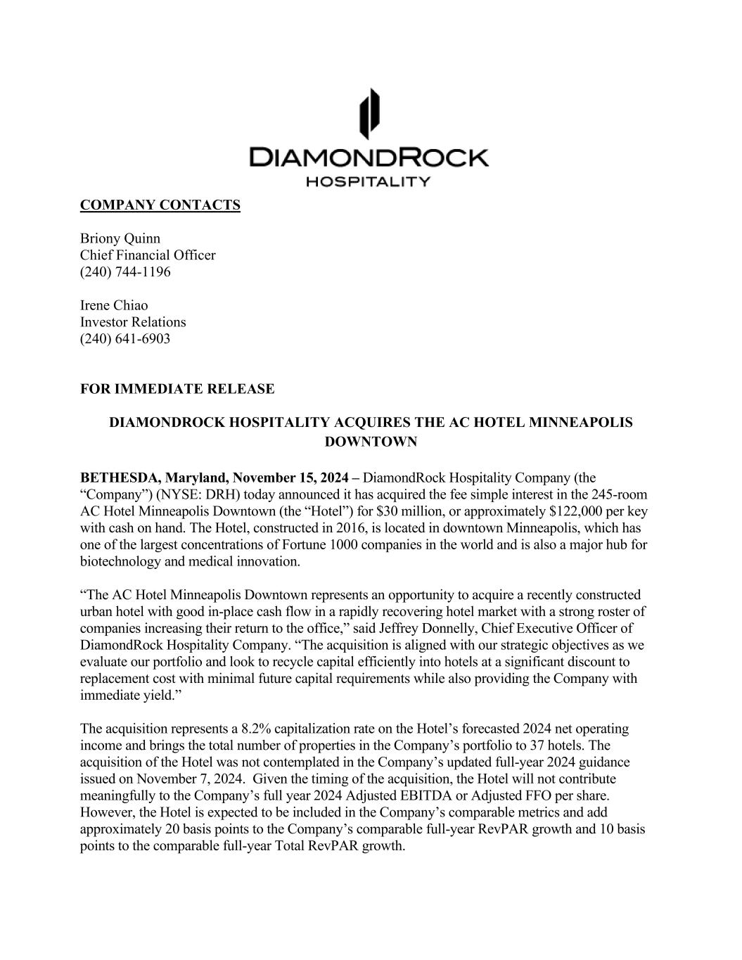 COMPANY CONTACTS Briony Quinn Chief Financial Officer (240) 744-1196 Irene Chiao Investor Relations (240) 641-6903 FOR IMMEDIATE RELEASE DIAMONDROCK HOSPITALITY ACQUIRES THE AC HOTEL MINNEAPOLIS DOWNTOWN BETHESDA, Maryland, November 15, 2024 – DiamondRock Hospitality Company (the “Company”) (NYSE: DRH) today announced it has acquired the fee simple interest in the 245-room AC Hotel Minneapolis Downtown (the “Hotel”) for $30 million, or approximately $122,000 per key with cash on hand. The Hotel, constructed in 2016, is located in downtown Minneapolis, which has one of the largest concentrations of Fortune 1000 companies in the world and is also a major hub for biotechnology and medical innovation. “The AC Hotel Minneapolis Downtown represents an opportunity to acquire a recently constructed urban hotel with good in-place cash flow in a rapidly recovering hotel market with a strong roster of companies increasing their return to the office,” said Jeffrey Donnelly, Chief Executive Officer of DiamondRock Hospitality Company. “The acquisition is aligned with our strategic objectives as we evaluate our portfolio and look to recycle capital efficiently into hotels at a significant discount to replacement cost with minimal future capital requirements while also providing the Company with immediate yield.” The acquisition represents a 8.2% capitalization rate on the Hotel’s forecasted 2024 net operating income and brings the total number of properties in the Company’s portfolio to 37 hotels. The acquisition of the Hotel was not contemplated in the Company’s updated full-year 2024 guidance issued on November 7, 2024. Given the timing of the acquisition, the Hotel will not contribute meaningfully to the Company’s full year 2024 Adjusted EBITDA or Adjusted FFO per share. However, the Hotel is expected to be included in the Company’s comparable metrics and add approximately 20 basis points to the Company’s comparable full-year RevPAR growth and 10 basis points to the comparable full-year Total RevPAR growth.